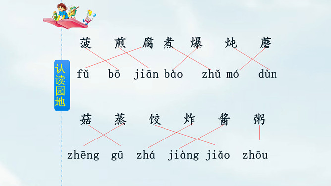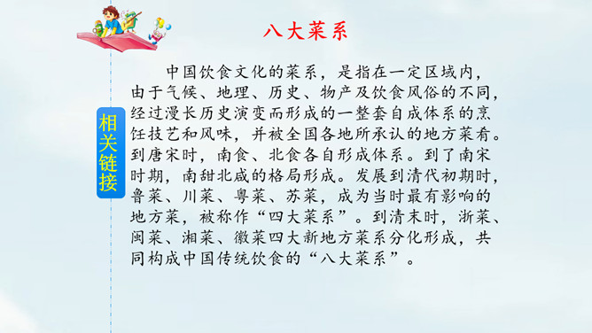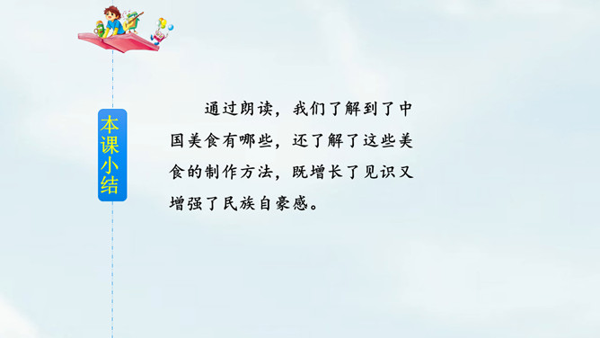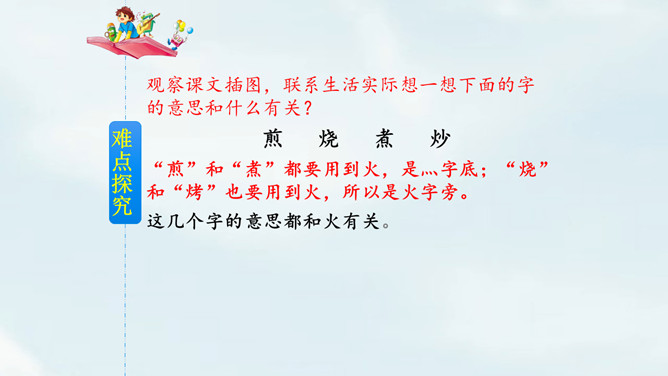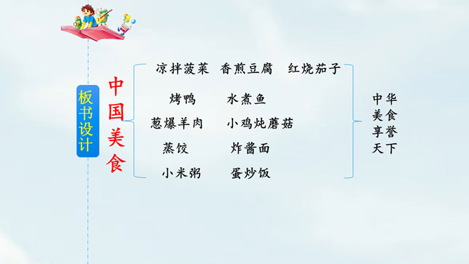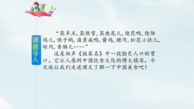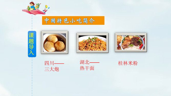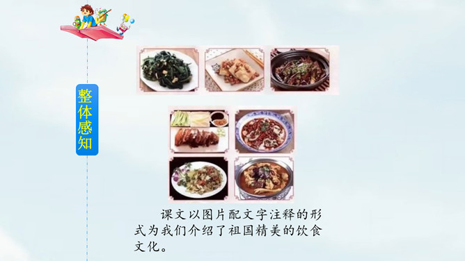 这是相声《报菜名》中一段脍炙人口的贯口。它让人感到中国饮食文化的博大精深。今天就让我们走进课文了解一下中国美食吧!课文以图片配文字注释的形式为我们介绍了祖国精美的饮食文化。观察课文插图,联系生活实际想一想下面的字的意思和什么有关?“煎”和“煮”都要用到火,是灬字底;“烧”和“烤”也要用到火,所以是火字旁。这几个字的意思都和火有关。通过朗读,我们了解到了中国美食有哪些,还了解了这些美食的制作方法。所属专题:中国美食ppt。