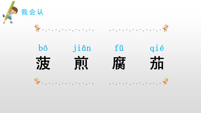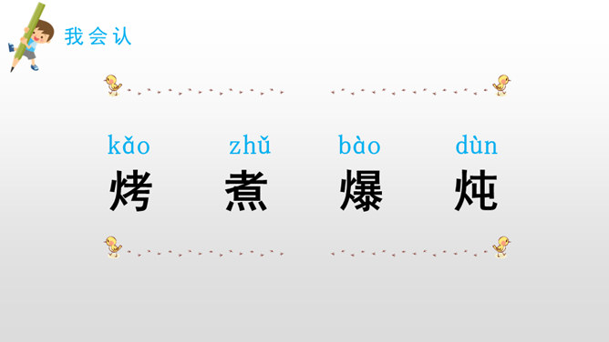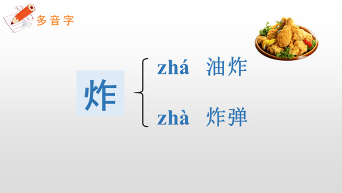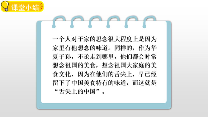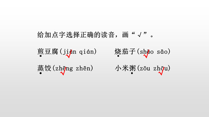 课堂小结:一个人对于家的思念很大程度上是因为家里有他想念的味道。同样的,作为华夏子孙,不论走到哪里,他们都会时常想念祖国的美食,想念祖国大家庭的美食文化,因为在他们的舌尖上,早已经留下了中国美食特有的味道,而这就是“舌尖上的中国”。给加点字选择正确的读音,画“√”。所属专题:中国美食ppt。