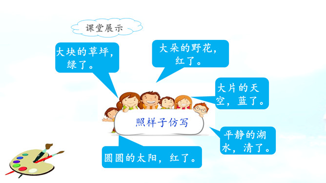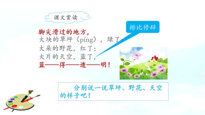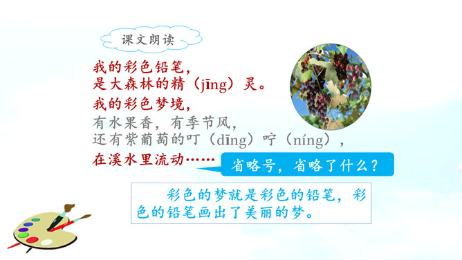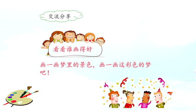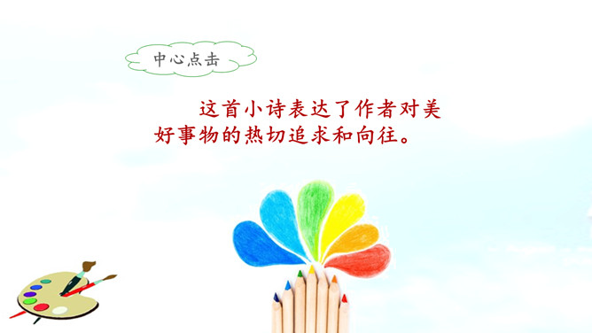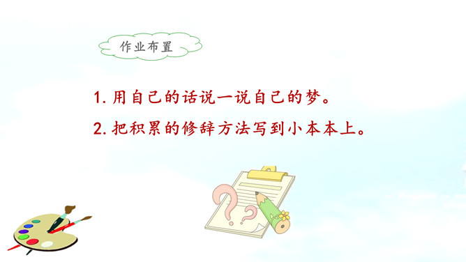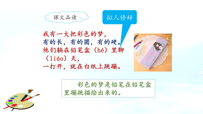 彩色的梦是铅笔在铅笔盒里蹦跳描绘出来的。分别说一说草坪、野花、天空的样子吧!谁来说一说彩笔画下的梦里有什么?看看谁画得好,画一画梦里的景色,画一画这彩色的梦吧!彩色的梦就是彩色的铅笔,彩色的铅笔画出了美丽的梦。省略号,省略了什么?这首小诗表达了作者对美好事物的热切追求和向往。作业布置:1.用自己的话说一说自己的梦。2.把积累的修辞方法写到小本本上。所属专题:彩色的梦ppt。