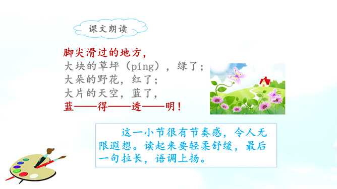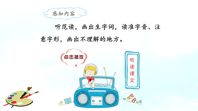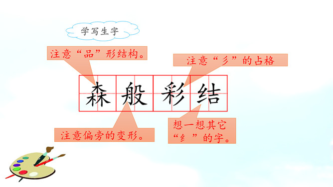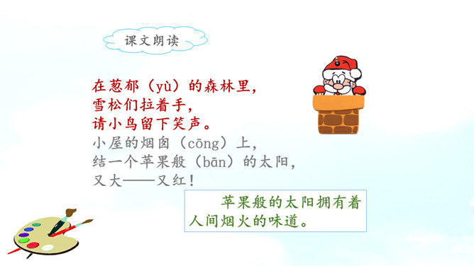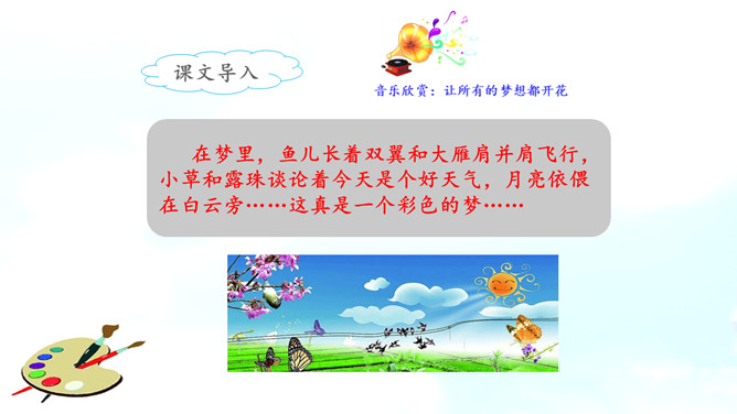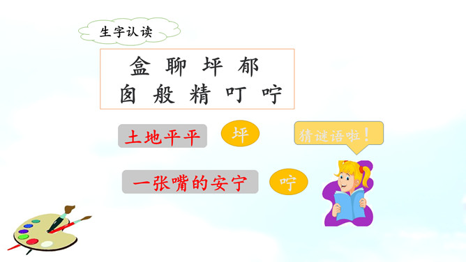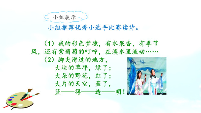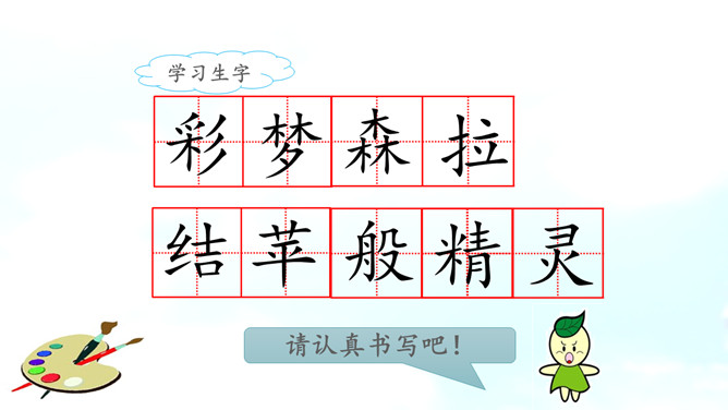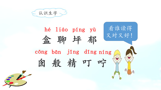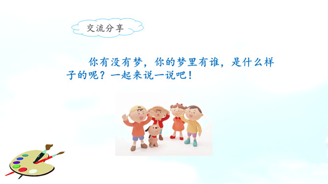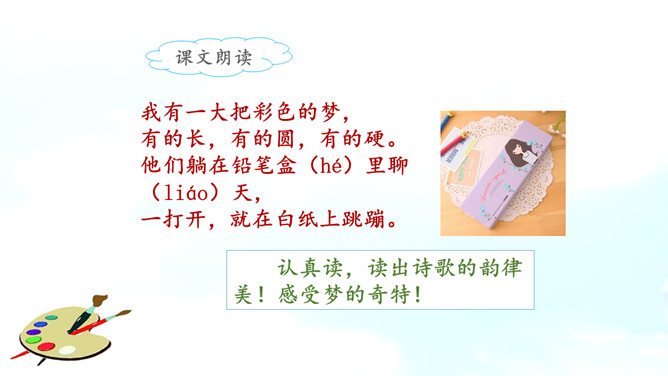 看谁读得又对又好!听范读,画出生字词,读准字音、注意字形,画出不理解的地方。认真读,读出诗歌的韵律美!感受梦的奇特!这一小节很有节奏感,令人无限遐想。读起来要轻柔舒缓,最后一句拉长,语调上扬。苹果般的太阳拥有着人间烟火的味道。怀着深情来诵读这一小节,体会如梦如幻的感觉。小组推荐优秀小选手比赛读诗。你有没有梦,你的梦里有谁,是什么样子的呢?一起来说一说吧!注意“品”形结构。注意偏旁的变形。所属专题:彩色的梦ppt。