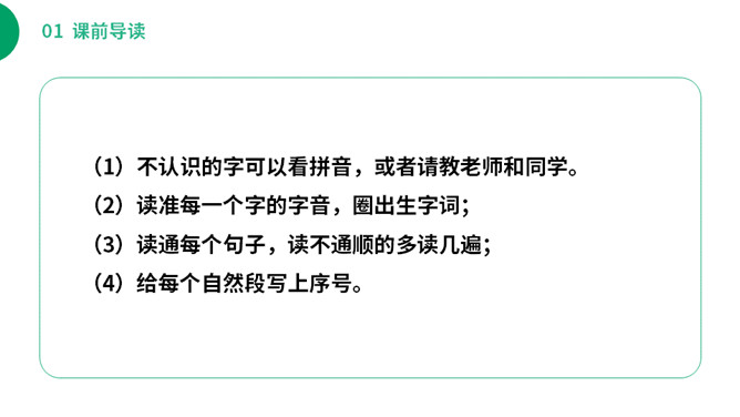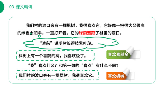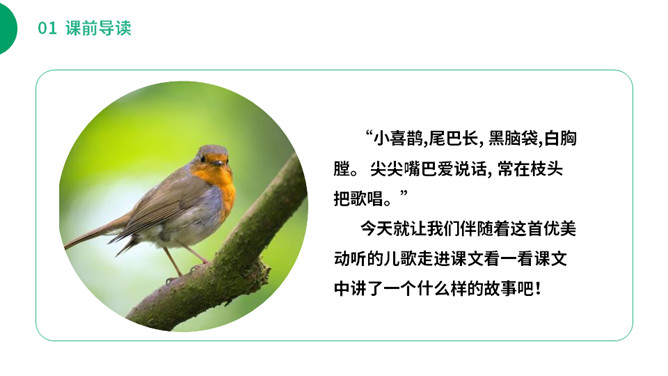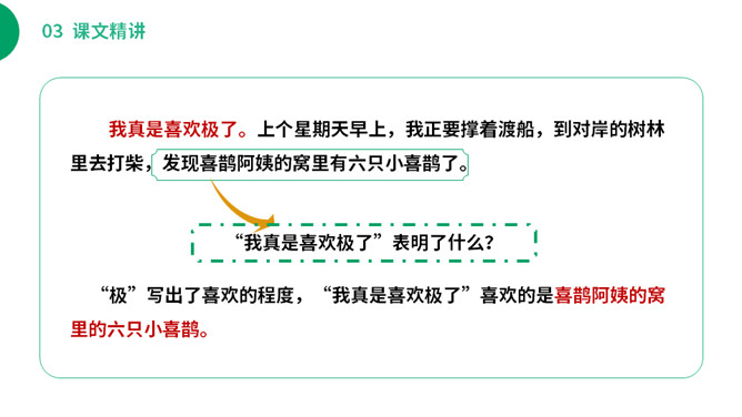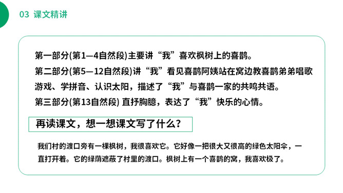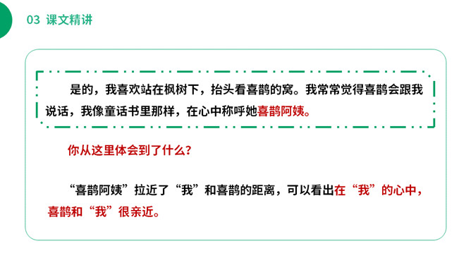 (1)不认识的字可以看拼音,或者请教老师和同学。(2)读准每一个字的字音,圈出生字词;(3)读通每个句子,读不通顺的多读几遍;(4)给每个自然段写上序号。你从这里体会到了什么?“喜鹊阿姨”拉近了“我”和喜鹊的距离,可以看出在“我”的心中,喜鹊和“我”很亲近。“我真是喜欢极了”表明了什么?“极”写出了喜欢的程度,“我真是喜欢极了”喜欢的是喜鹊阿姨的窝里的六只小喜鹊。所属专题:枫树上的喜鹊ppt。