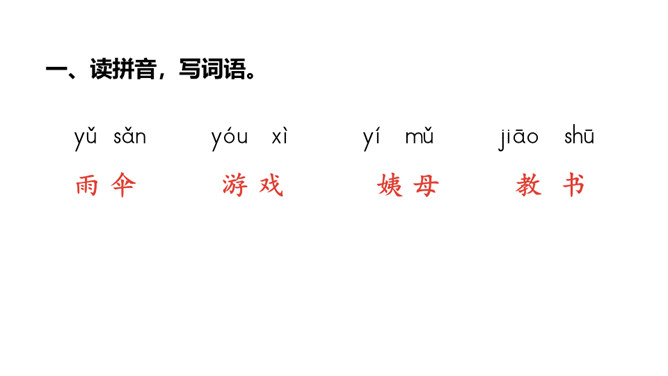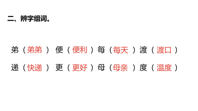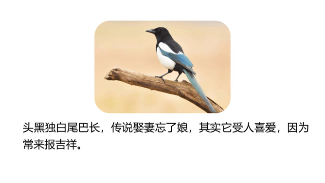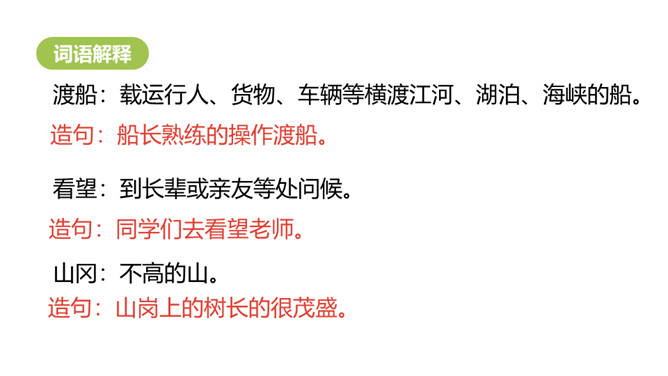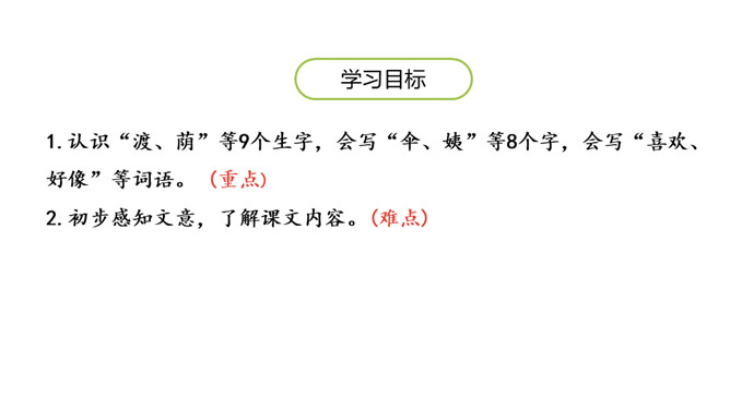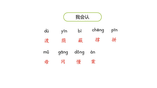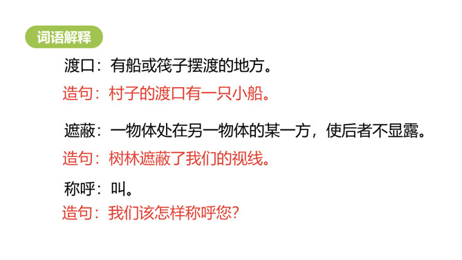 1.认识“渡、荫”等9个生字,会写“伞、姨”等8个字,会写“喜欢、好像”等词语。 (重点)2.初步感知文意,了解课文内容。(难点)初读课文,想一想课文写了几部分内容?第一部分(1-4段)“我”喜欢枫树上的喜鹊。第二部分(5-12段)“我”看见喜鹊阿姨教喜鹊弟弟唱歌、做游戏、学拼音字母、人是太阳。第三部分(13段)表达了“我”快乐的心情。渡口:有船或筏子摆渡的地方。造句:村子的渡口有一只小船。所属专题:枫树上的喜鹊ppt。