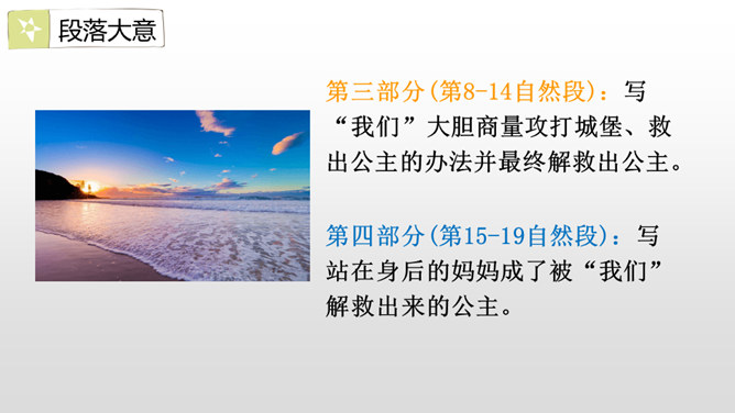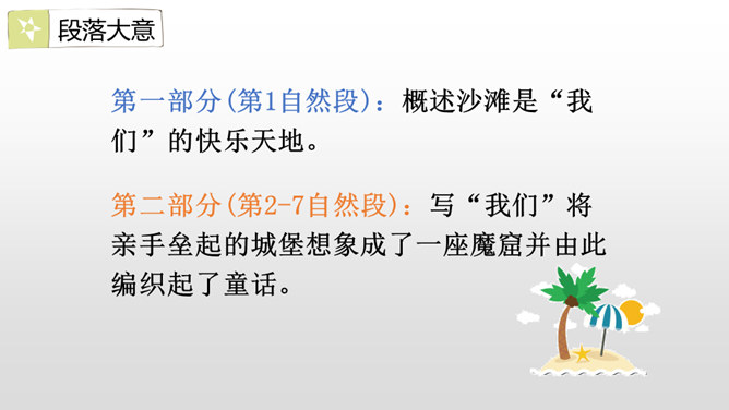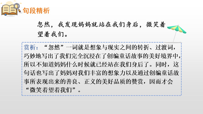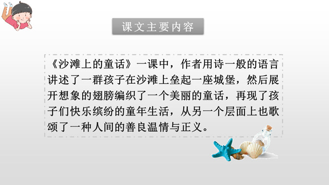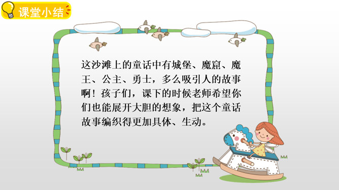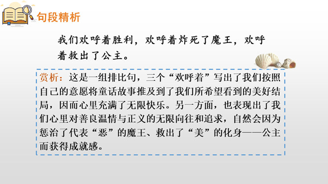 赏析:这是一组排比句,三个“欢呼着”写出了我们按照自己的意愿将童话故事推及到了我们所希望看到的美好结局,因而心里充满了无限快乐。另一方面,也表现出了我们心里对善良温情与正义的无限向往和追求,自然会因为惩治了代表“恶”的魔王、救出了“美”的化身——公主而获得成就感。作者用诗一般的语言讲述了一群孩子在沙滩上垒起一座城堡,然后展开想象的翅膀编织了一个美丽的童话,再现了孩子们快乐缤纷的童年生活,从另一个层面上也歌颂了一种人间的善良温情与正义。所属专题:沙滩上的童话ppt。