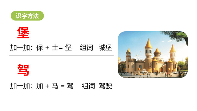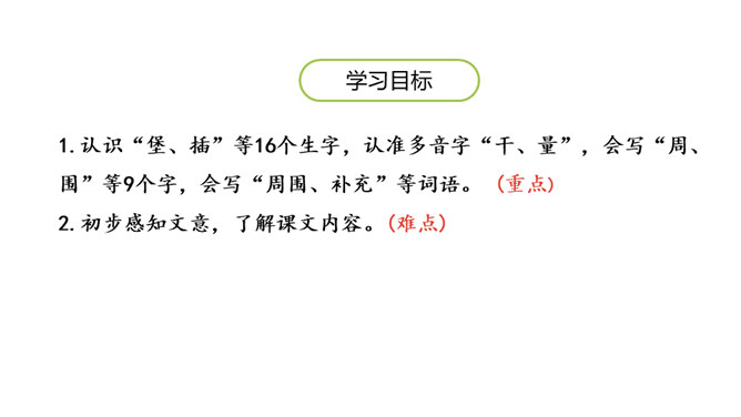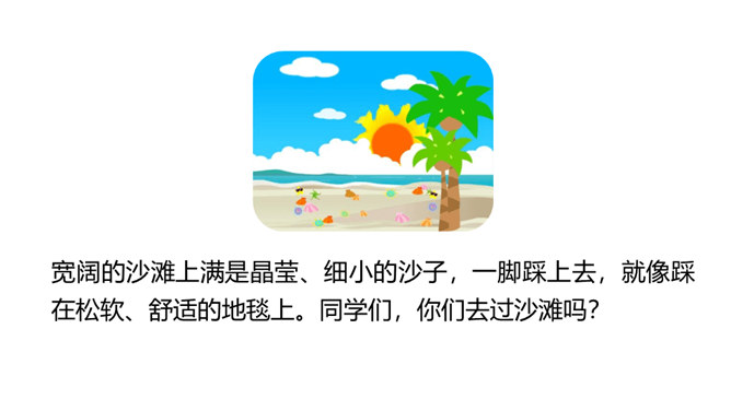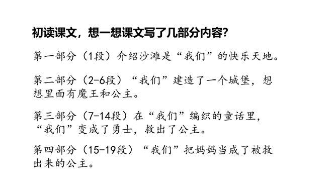 1.认识“堡、插”等16个生字,认准多音字“干、量”,会写“周、围”等9个字,会写“周围、补充”等词语。 (重点)2.初步感知文意,了解课文内容。(难点)宽阔的沙滩上满是晶莹、细小的沙子,一脚踩上去,就像踩在松软、舒适的地毯上。同学们,你们去过沙滩吗?第一部分(1段)介绍沙滩是“我们”的快乐天地。第二部分(2-6段)“我们”建造了一个城堡,想想里面有魔王和公主。第三部分(7-14段)在“我们”编织的童话里,“我们”变成了勇士,救出了公主。所属专题:沙滩上的童话ppt。
