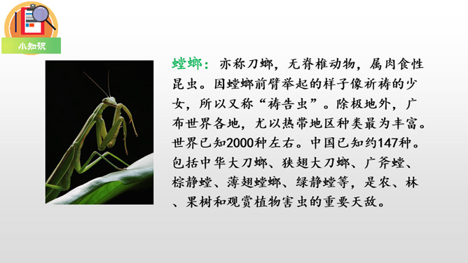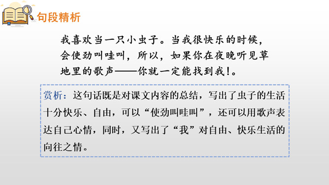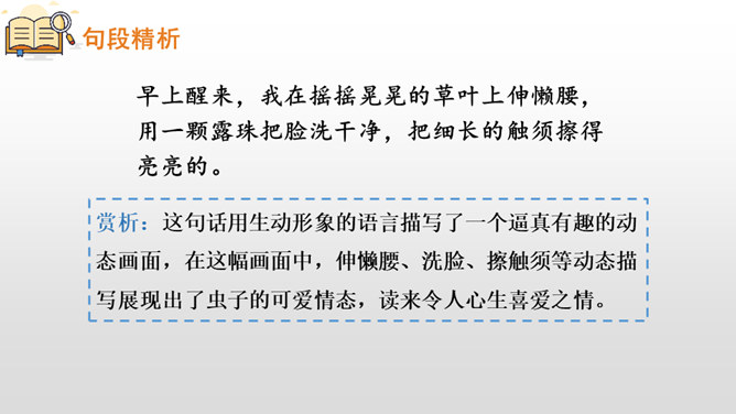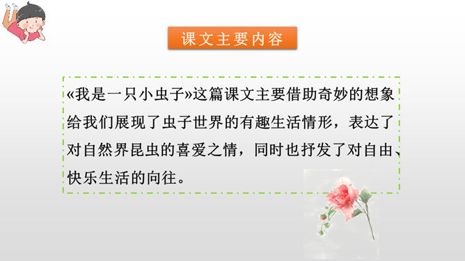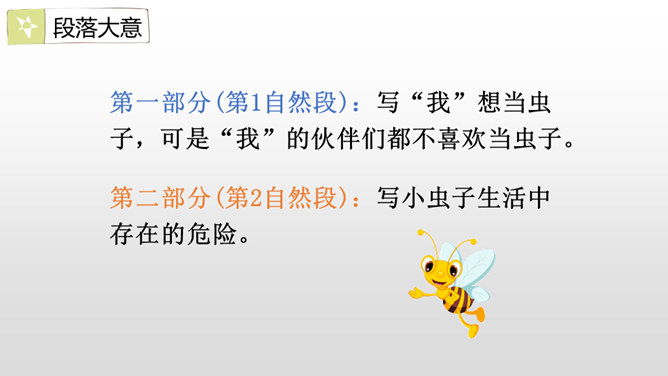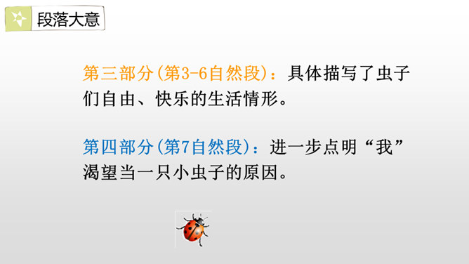 第一部分(第1自然段):写“我”想当虫子,可是“我”的伙伴们都不喜欢当虫子。第二部分(第2自然段):写小虫子生活中存在的危险。第三部分(第3-6自然段):具体描写了虫子们自由、快乐的生活情形。第四部分(第7自然段):进一步点明“我”渴望当一只小虫子的原因。这篇课文主要借助奇妙的想象给我们展现了虫子世界的有趣生活情形,表达了对自然界昆虫的喜爱之情,同时也抒发了对自由、快乐生活的向往。所属专题:我是一只小虫子ppt。