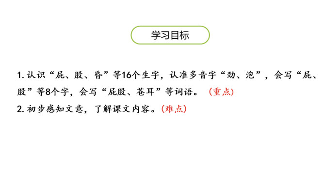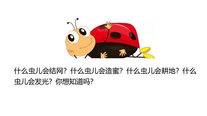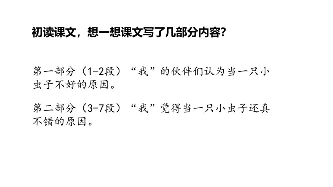 1.认识“屁、股、昏”等16个生字,认准多音字“劲、泡”,会写“屁、股”等8个字,会写“屁股、苍耳”等词语。 (重点)2.初步感知文意,了解课文内容。(难点)什么虫儿会结网?什么虫儿会造蜜?什么虫儿会耕地?什么虫儿会发光?你想知道吗?初读课文,想一想课文写了几部分内容?第一部分(1-2段)“我”的伙伴们认为当一只小虫子不好的原因。第二部分(3-7段)“我”觉得当一只小虫子还真不错的原因。所属专题:我是一只小虫子ppt。