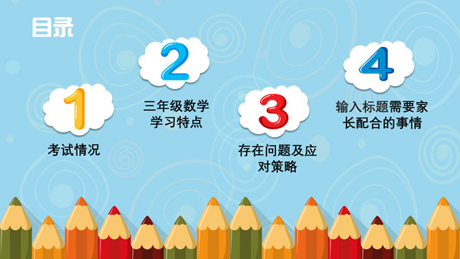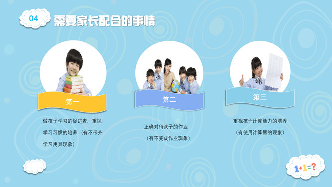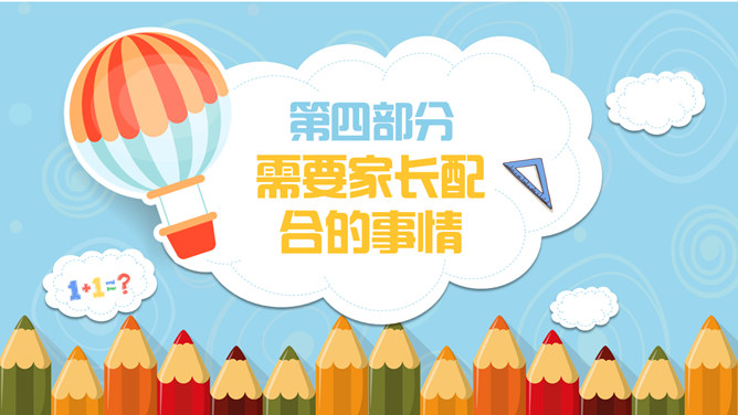 可爱卡通小学家长会PPT模板。一套幼儿园小学家长会幻灯片模板,清新配色,可爱卡通设计风格,精美实用。