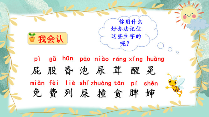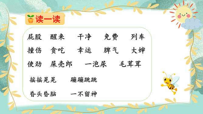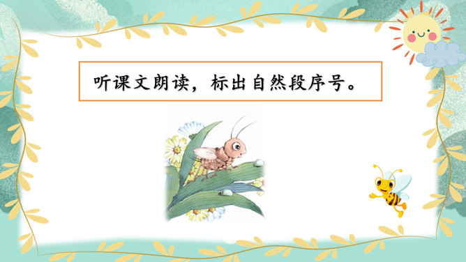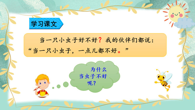 同桌开火车读课文,读通顺,读准字音,停顿准确,注意语气。读完评一评。思考:这段话写出了当小虫子的哪些烦恼?我们蹦蹦跳跳的时候,一定要看准地方,不然屁股会被苍耳刺痛的。一不留神,我们会蹦进很深很深的水里,被淹得昏头昏脑。其实,那深水只是小狗撒的一泡尿。孩子们都觉得毛茸茸的小鸟很可爱,但我们小虫子没有谁会喜欢小鸟。小虫子的生活有烦恼也有乐趣,你喜欢做一只小虫子吗?把你想象成一只小虫子,给我们讲讲你的烦恼和乐趣吧!所属专题:我是一只小虫子ppt。
