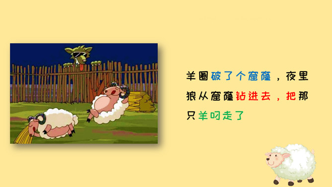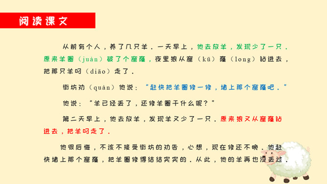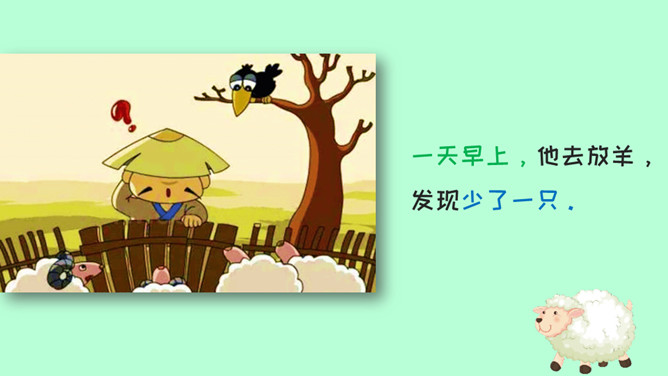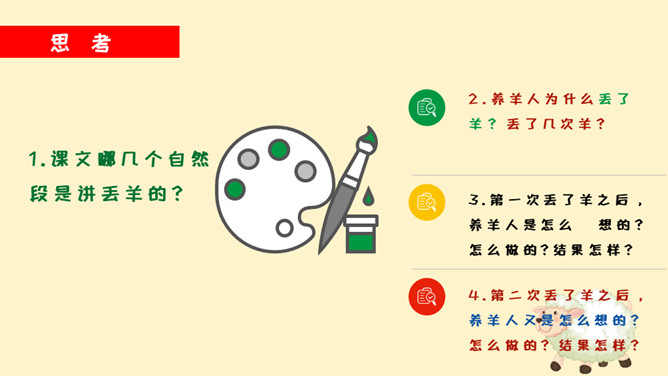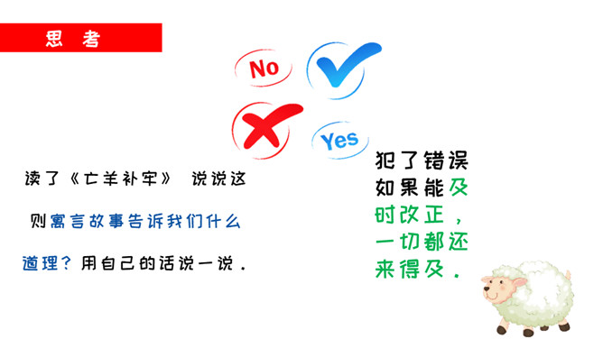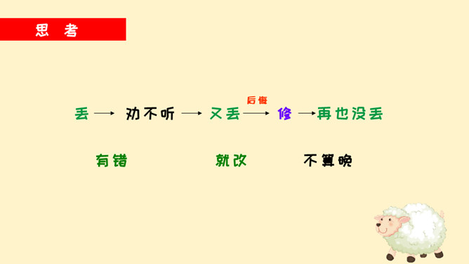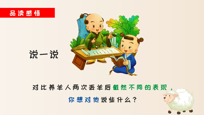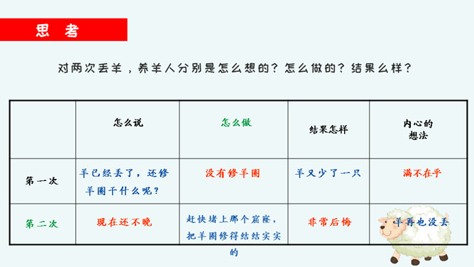 1.课文哪几个自然段是讲丢羊的?2.养羊人为什么丢了羊?丢了几次羊? 3.第一次丢了羊之后,养羊人是怎么 想的?怎么做的?结果怎样?4.第二次丢了羊之后,养羊人又是怎么想的?怎么做的?结果怎样? 对两次丢羊,养羊人分别是怎么想的?怎么做的?结果么样? 对比养羊人两次丢羊后截然不同的表现,你想对他说些什么?说说这则寓言故事告诉我们什么道理?用自己的话说一说。所属专题:亡羊补牢ppt。