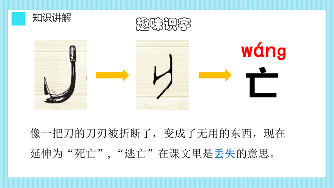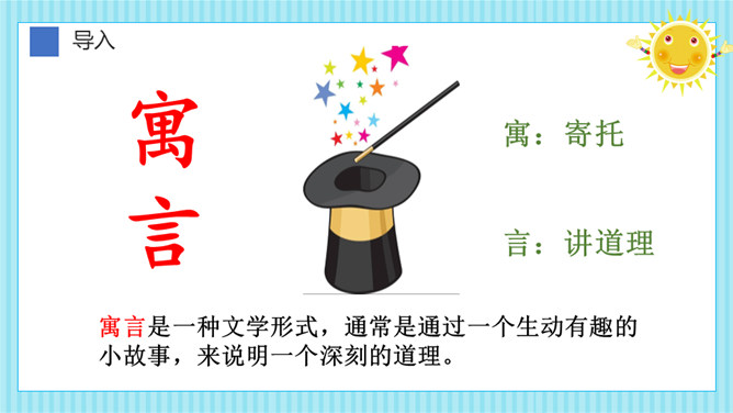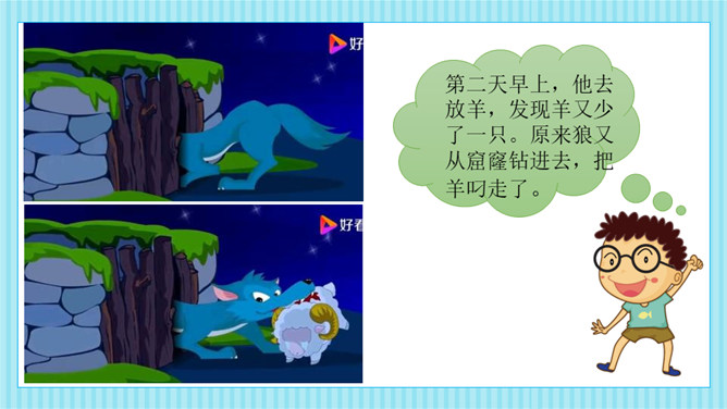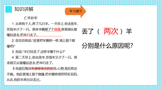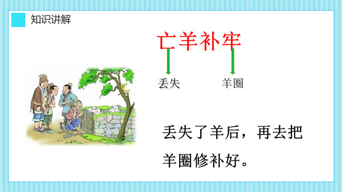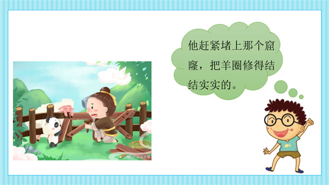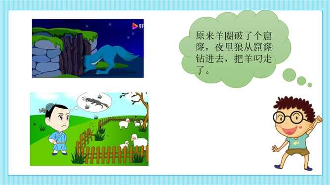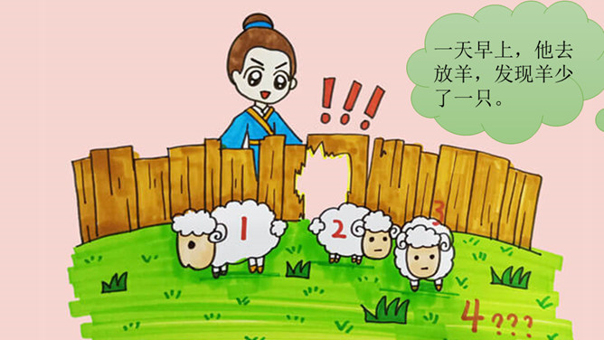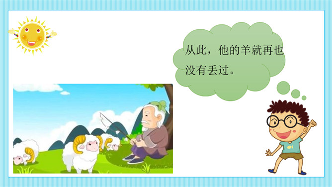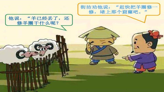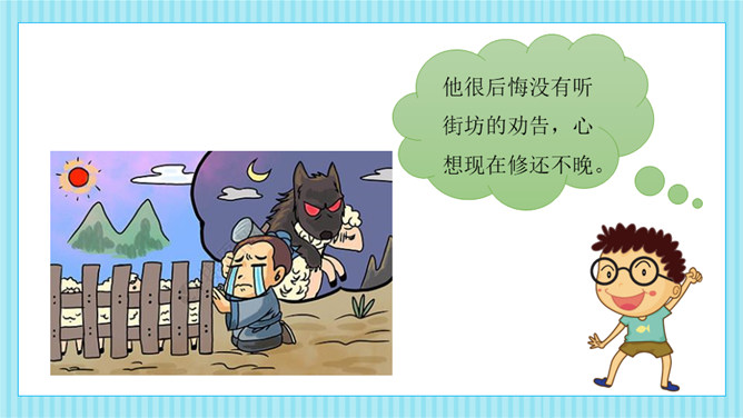 这则寓言告诉我们一个人做错了事,只要肯接受意见,认真改正,就不算晚。生活中有没有像养羊人一样,做过一些“亡羊补牢”的事情呢?请你和大家分享一下。我平常不讲卫生,每次不洗手就吃东西,觉得不干不净,吃了没病,直到肚子疼,送到医院才知道洗手的重要性,从此只要吃东西就一定会洗手,再也没有生过病啦。我爱睡懒觉,还不肯定闹钟,第二天早上起不来,迟到好几次后才开始定闹钟,早睡早起,从此再也没迟到过。所属专题:亡羊补牢ppt。