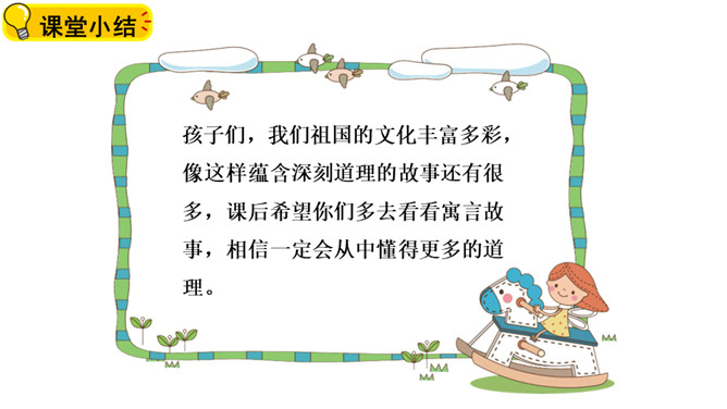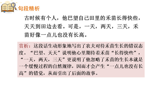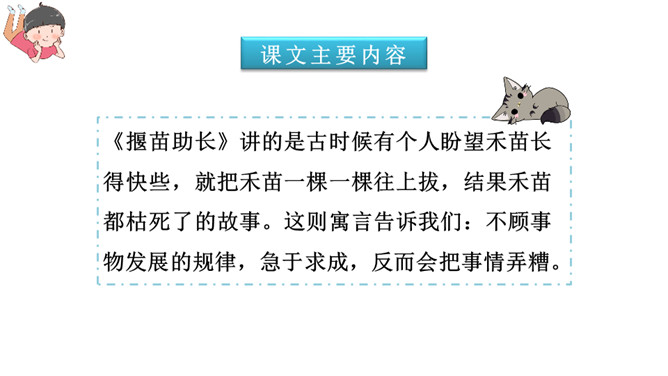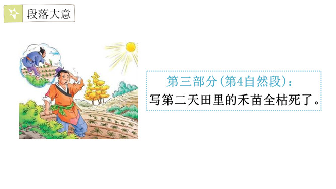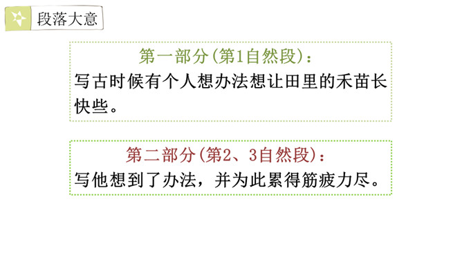 第一部分(第1自然段):写古时候有个人想办法想让田里的禾苗长快些。第二部分(第2、3自然段):写他想到了办法,并为此累得筋疲力尽。第三部分(第4自然段):写第二天田里的禾苗全枯死了。的是古时候有个人盼望禾苗长得快些,就把禾苗一棵一棵往上拔,结果禾苗都枯死了的故事。这则寓言告诉我们:不顾事物发展的规律,急于求成,反而会把事情弄糟。孩子们,我们祖国的文化丰富多彩,像这样蕴含深刻道理的故事还有很多,课后希望你们多去看看寓言故事,相信一定会从中懂得更多的道理。所属专题:揠苗助长ppt。