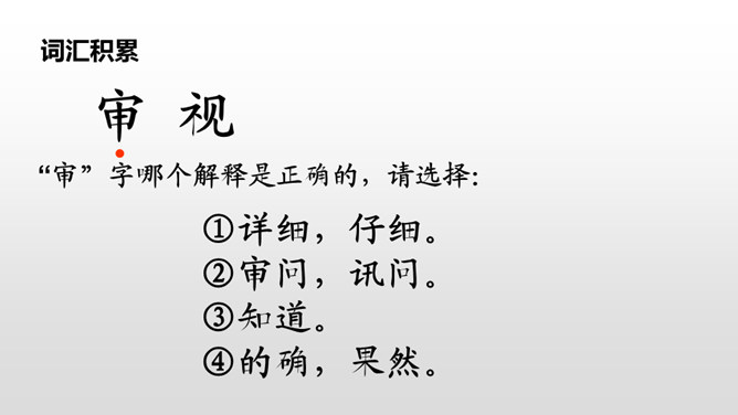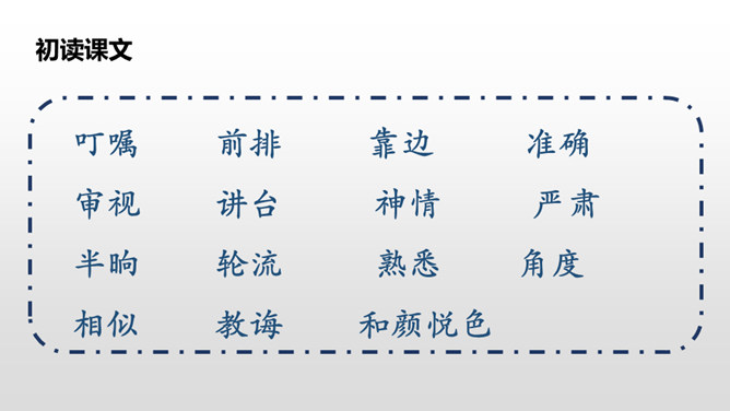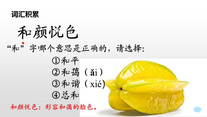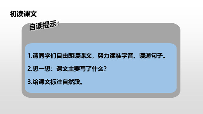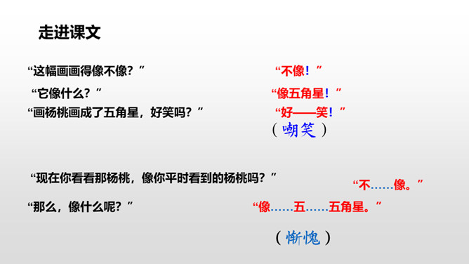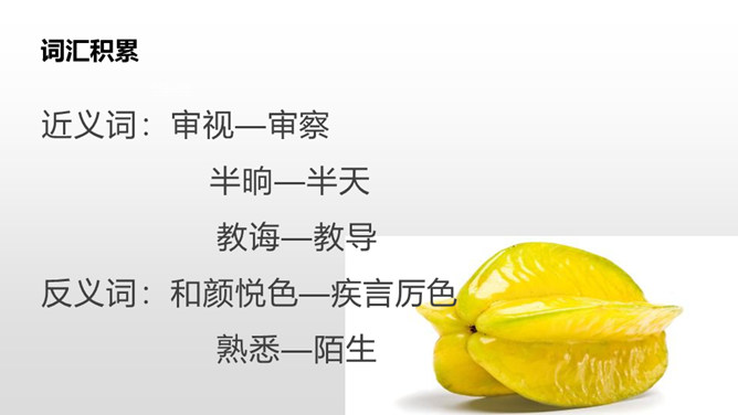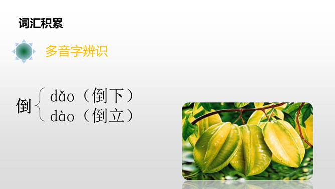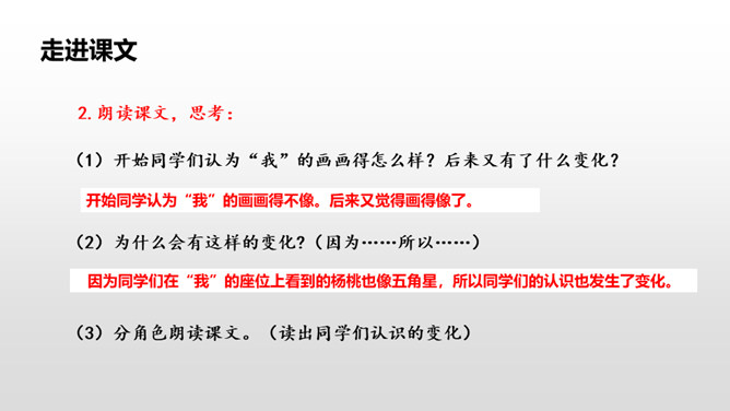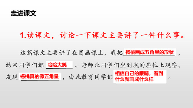 1.请同学们自由朗读课文,努力读准字音、读通句子。2.想一想:课文主要写了什么?3.给课文标注自然段。读课文,讨论一下课文主要讲了一件什么事。这篇课文主要讲了在图画课上,我把杨桃画成五角星的形状,结果同学们都哈哈大笑。老师让同学们坐到我的座位上观察,发现杨桃真的像五角星,由此教育同学们相信自己的眼睛,看到什么就画成什么样。朗读课文,思考:开始同学们认为“我”的画画得怎么样?后来又有了什么变化?所属专题:画杨桃ppt。