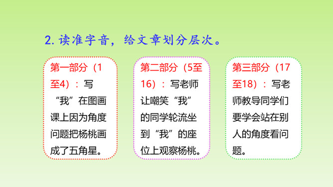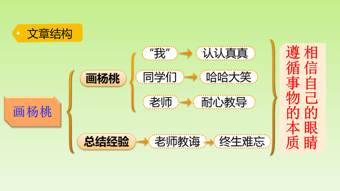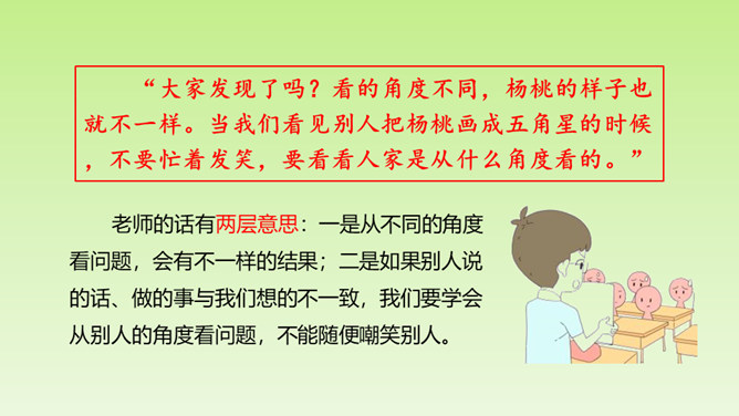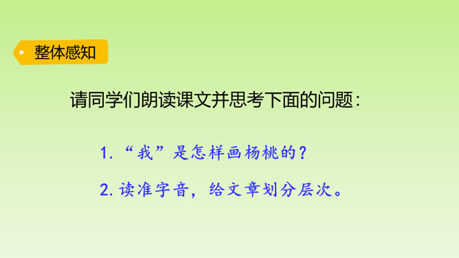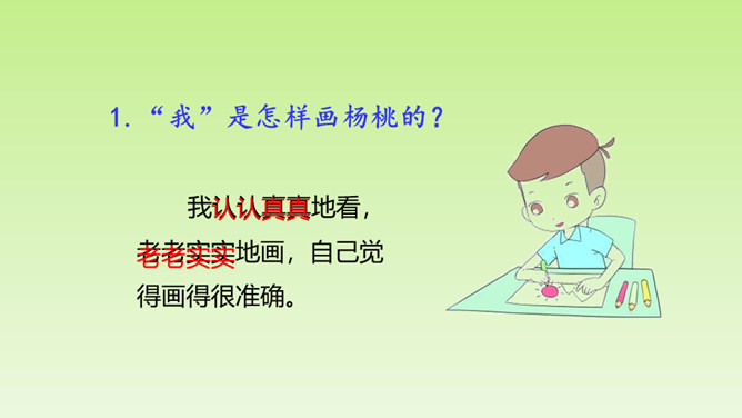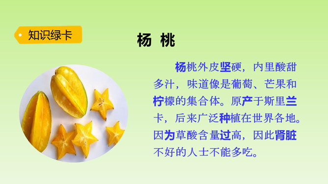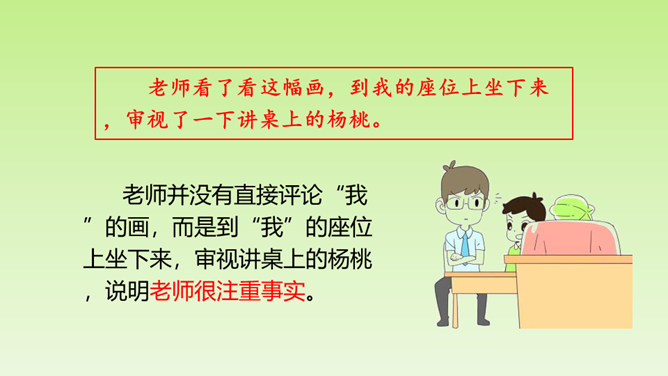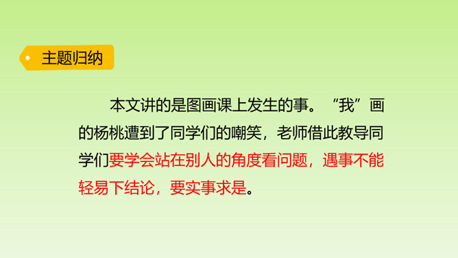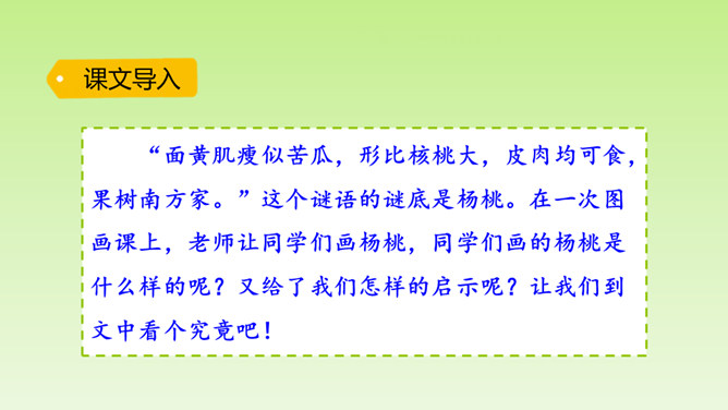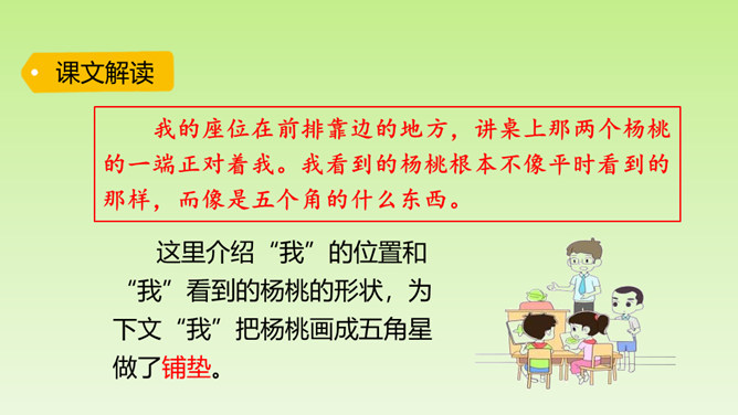 “面黄肌瘦似苦瓜,形比核桃大,皮肉均可食,果树南方家。”这个谜语的谜底是杨桃。在一次图画课上,老师让同学们画杨桃,同学们画的杨桃是什么样的呢?又给了我们怎样的启示呢?让我们到文中看个究竟吧!这里介绍“我”的位置和“我”看到的杨桃的形状,为下文“我”把杨桃画成五角星做了铺垫。老师并没有直接评论“我”的画,而是到“我”的座位上坐下来,审视讲桌上的杨桃,说明老师很注重事实。所属专题:画杨桃ppt。
