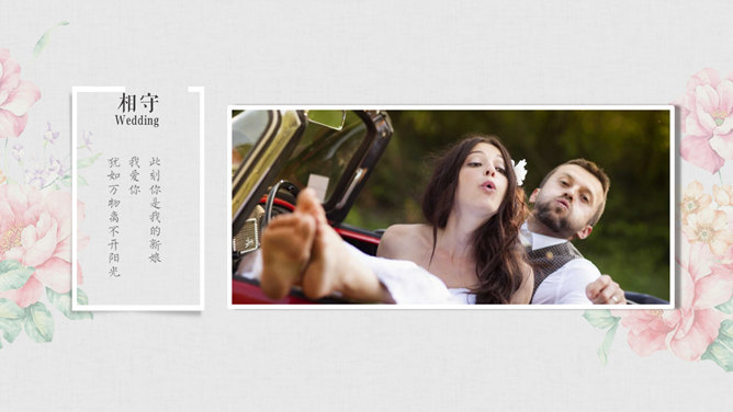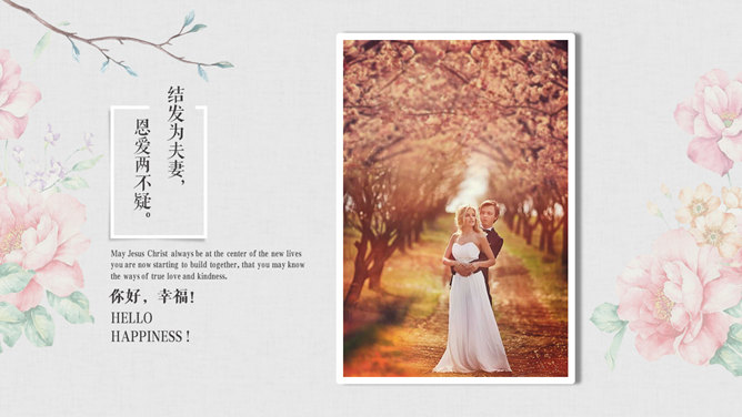 我们结婚啦婚礼相册PPT模板。一套精美婚礼相册幻灯片模板,淡雅或多背景,多种图文排版方式,页面类型丰富。