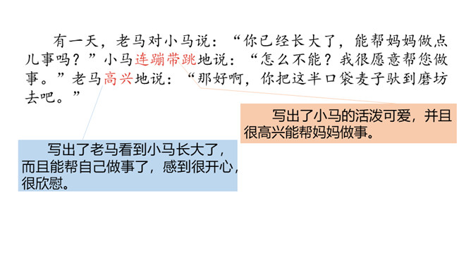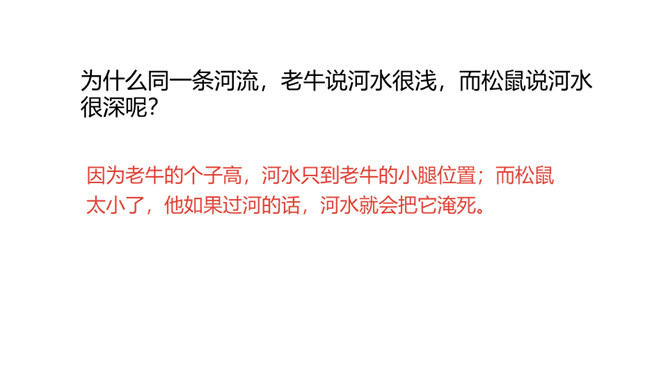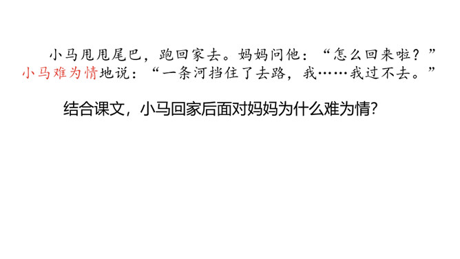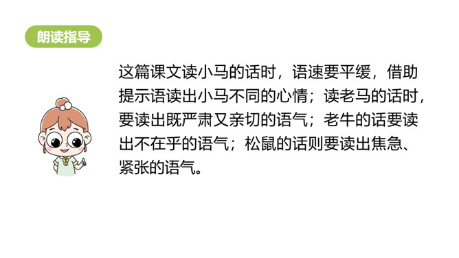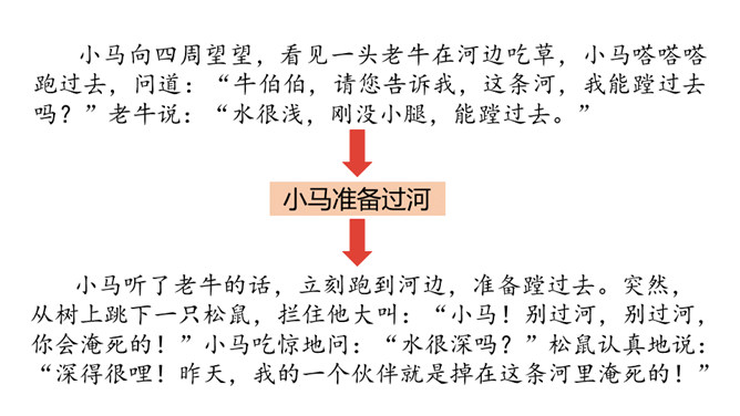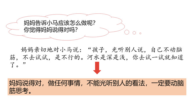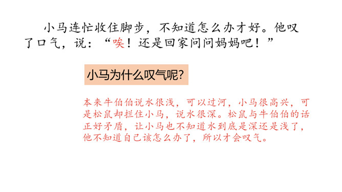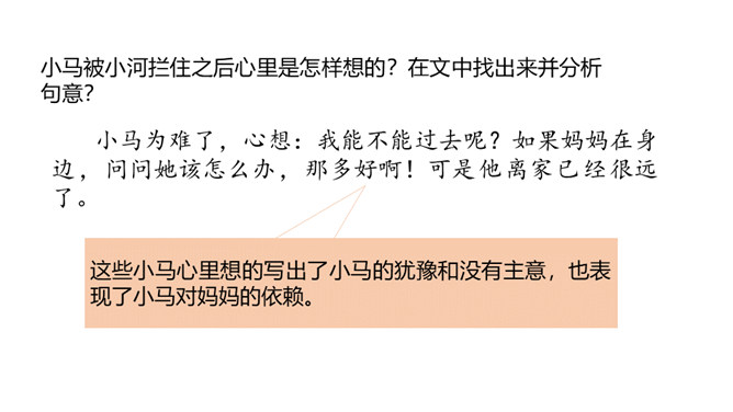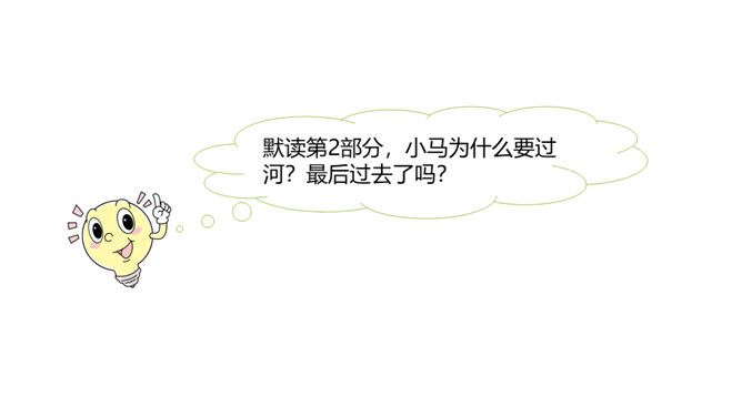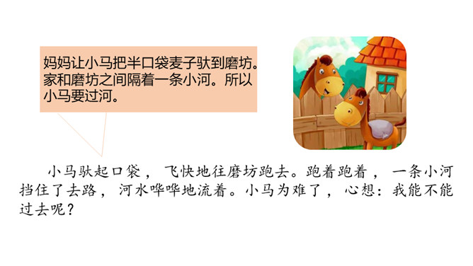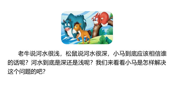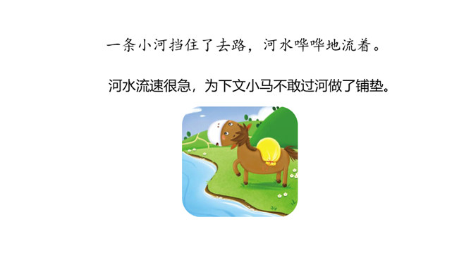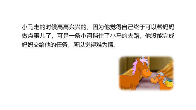 1.分角色朗读,能读出恰当的语气。能根据课文内容,说出自己的看法。 2.能用上提供的词语讲故事。老牛说河水很浅,松鼠说河水很深,小马到底应该相信谁的话呢?河水到底是深还是浅呢?我们来看看小马是怎样解决这个问题的吧?默读第1部分,小马帮妈妈做事。写出了老马看到小马长大了,而且能帮自己做事了,感到很开心,很欣慰。写出了小马的活泼可爱,并且很高兴能帮妈妈做事。默读第2部分,小马为什么要过河?最后过去了吗?所属专题:小马过河ppt。