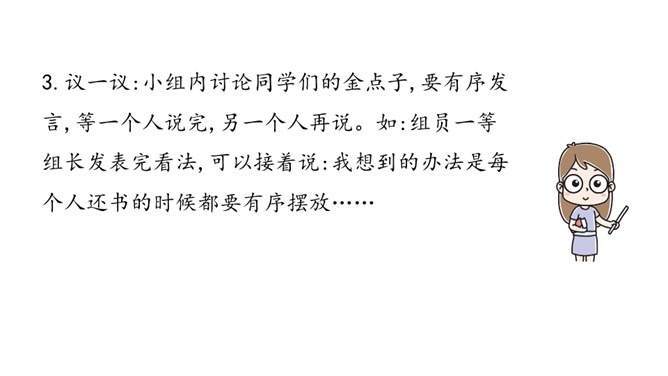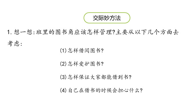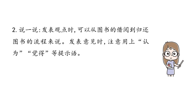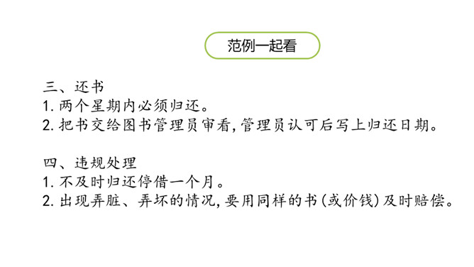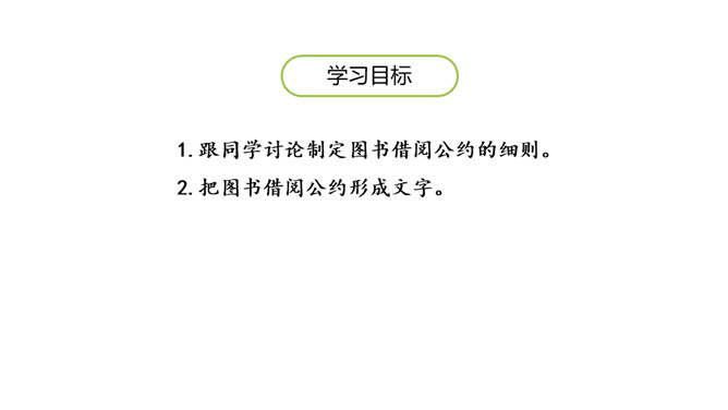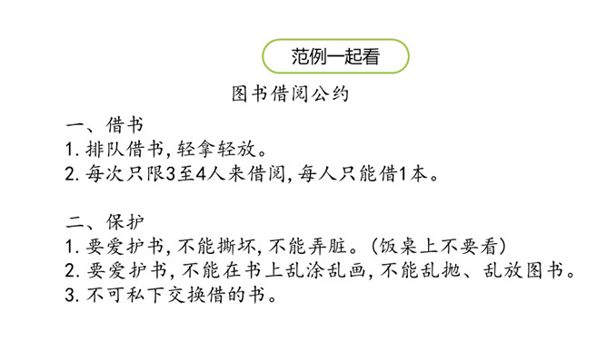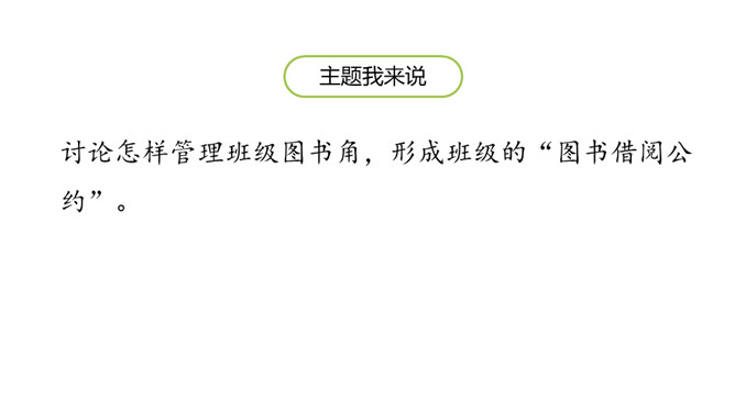 学习目标:1.跟同学讨论制定图书借阅公约的细则。2.把图书借阅公约形成文字。讨论怎样管理班级图书角,形成班级的“图书借阅公约”。想一想:班里的图书角应该怎样管理?主要从以下几个方面去考虑:(1)怎样借阅图书?(2)怎样爱护图书?(3)怎样保证大家都能借到书?(4)自己在借书的时候会担心什么?说一说:发表观点时,可以从图书的借阅到归还图书的流程来说。发表意见时,注意用上“认为”“觉得”等提示语。所属专题:图书借阅公约ppt。