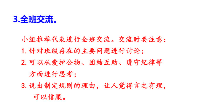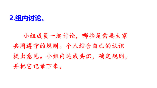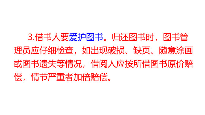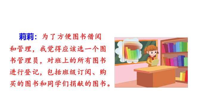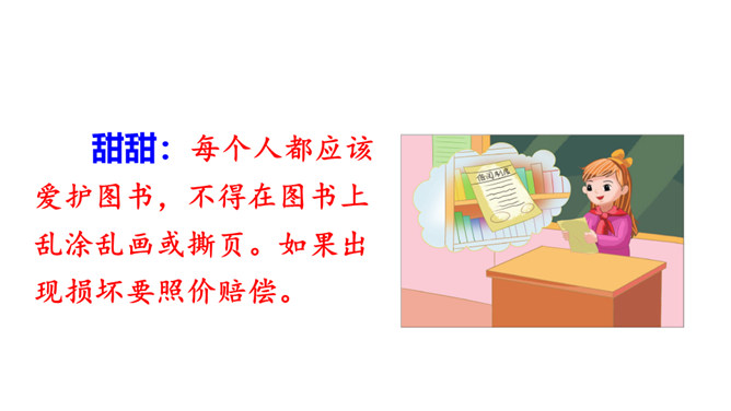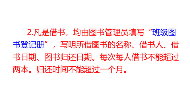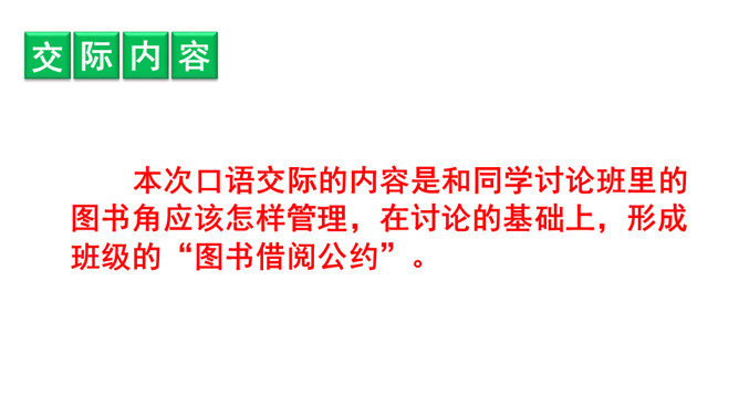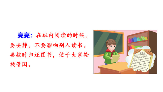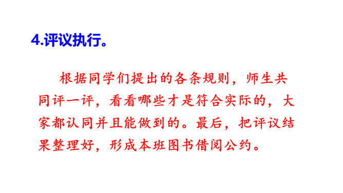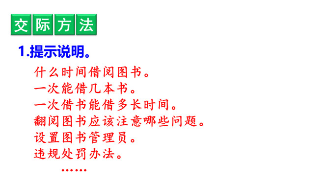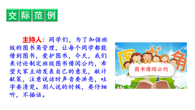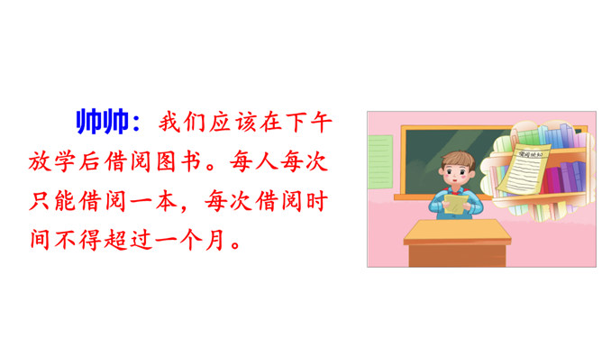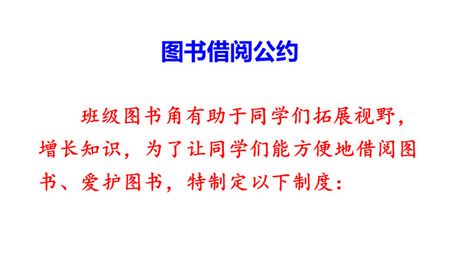 提示说明。什么时间借阅图书。一次能借几本书。一次借书能借多长时间。翻阅图书应该注意哪些问题。设置图书管理员。违规处罚办法。组内讨论。小组成员一起讨论,哪些是需要大家共同遵守的规则。个人结合自己的认识提出意见。小组内达成共识,确定规则,并把它记录下来。小组推举代表进行全班交流。交流时要注意:1.针对班级存在的主要问题进行讨论;2.可以从爱护公物、团结互助、遵守纪律等方面进行思考;3.说出制定规则的理由,让人觉得言之有理,可以信服。所属专题:图书借阅公约ppt。