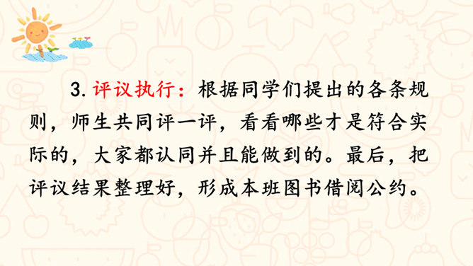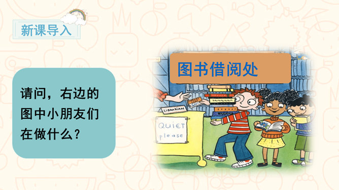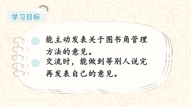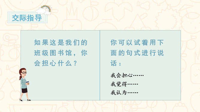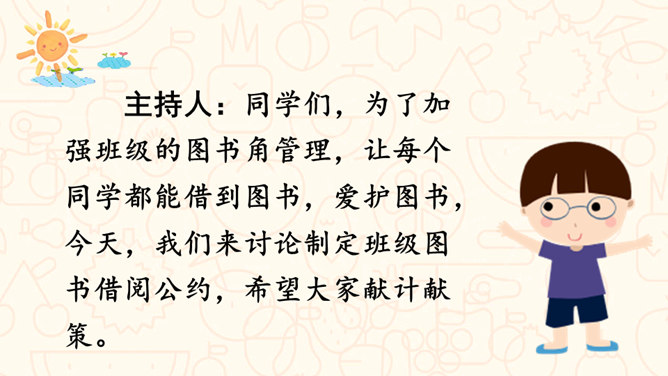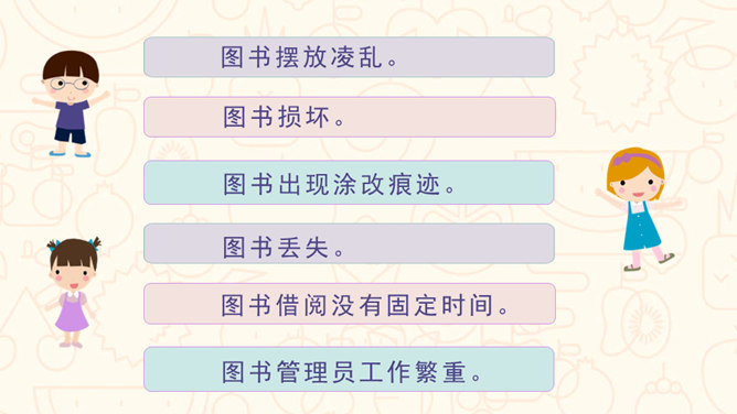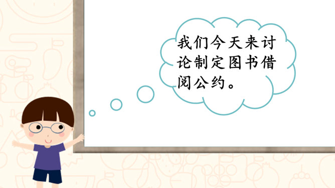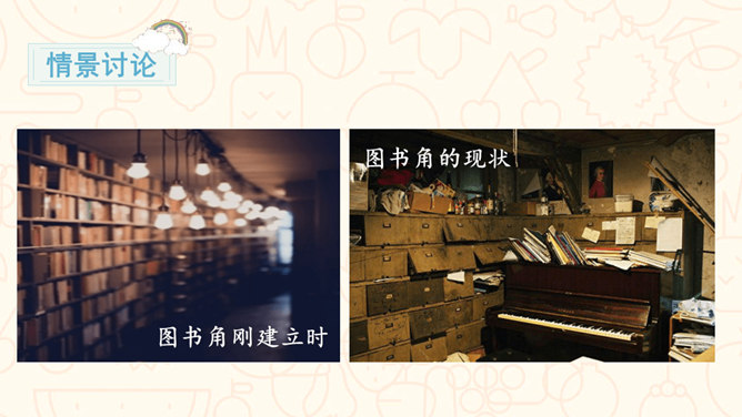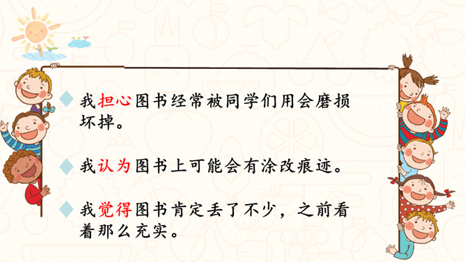 请问,右边的图中小朋友们在做什么?能主动发表关于图书角管理方法的意见。交流时,能做到等别人说完再发表自己的意见。从前面的两张图中,你看到了什么?如果这是我们的班级图书馆,你会担心什么?你可以试着用下面的句式进行说话:我担心图书经常被同学们用会磨损坏掉。我认为图书上可能会有涂改痕迹。我觉得图书肯定丢了不少,之前看着那么充实。所属专题:图书借阅公约ppt。