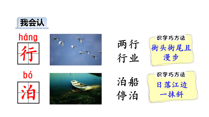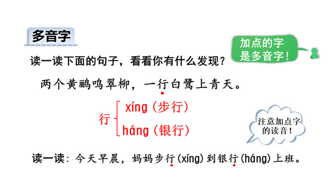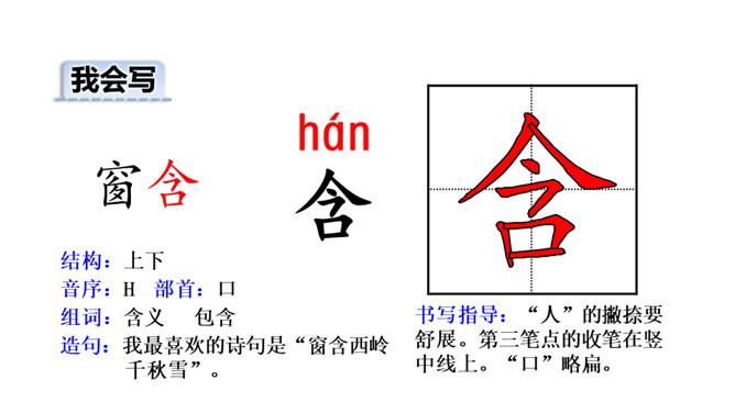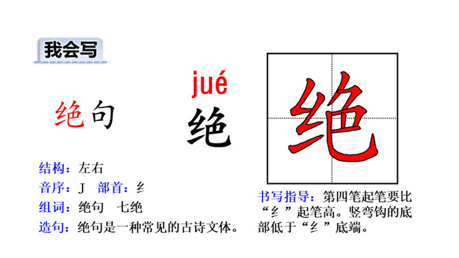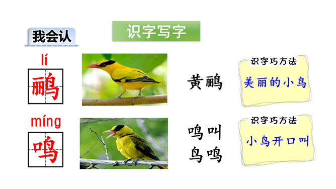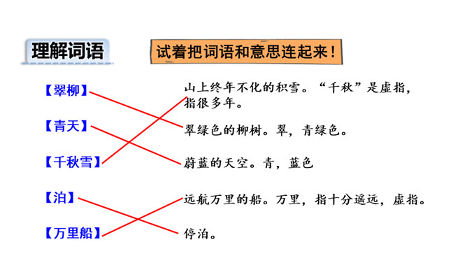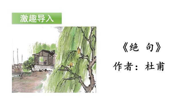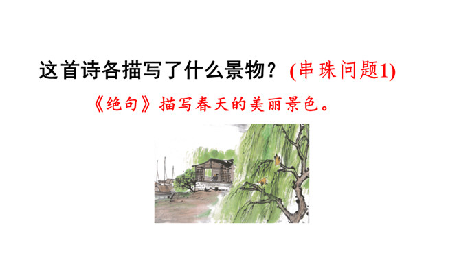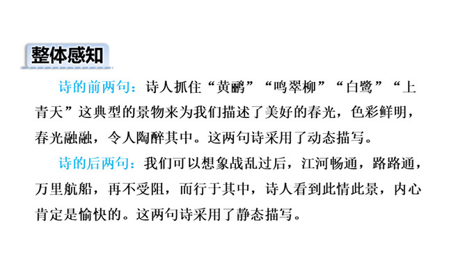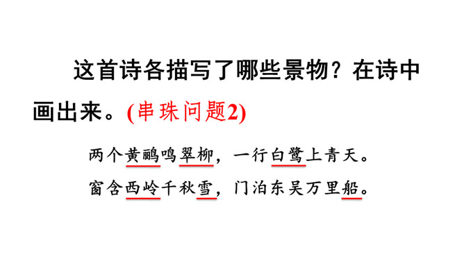 诗的前两句:诗人抓住“黄鹂”“鸣翠柳”“白鹭”“上青天”这典型的景物来为我们描述了美好的春光,色彩鲜明,春光融融,令人陶醉其中。这两句诗采用了动态描写。诗的后两句:我们可以想象战乱过后,江河畅通,路路通,万里航船,再不受阻,而行于其中,诗人看到此情此景,内心肯定是愉快的。这两句诗采用了静态描写。这首诗各描写了什么景物? (串珠问题1)描写春天的美丽景色。这首诗各描写了哪些景物?在诗中画出来。(串珠问题2)
