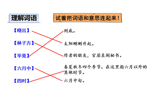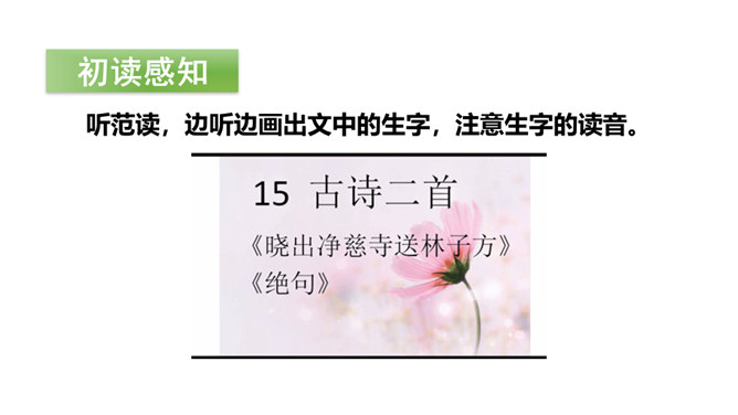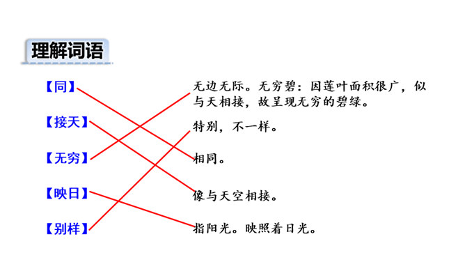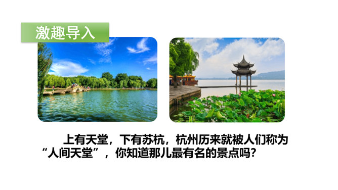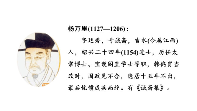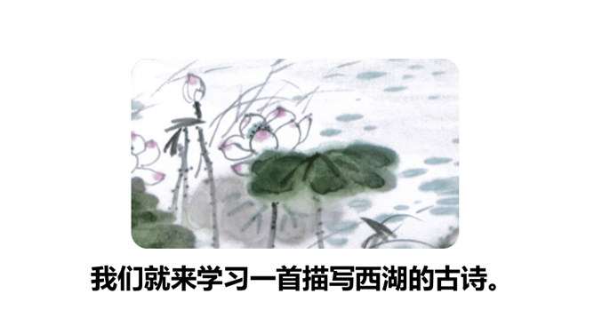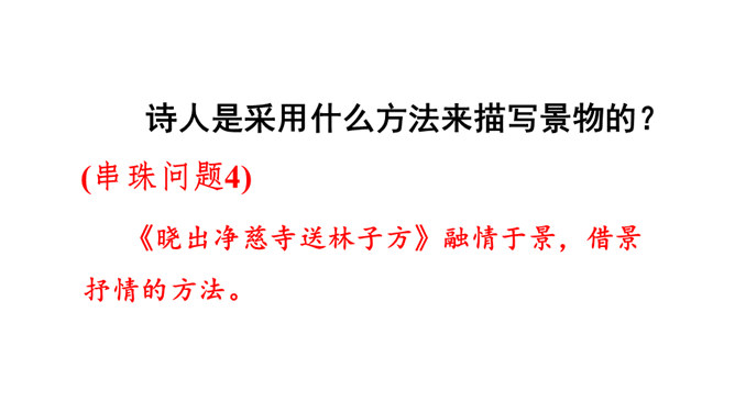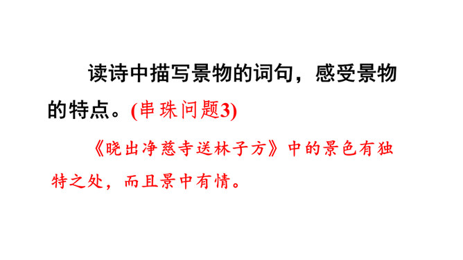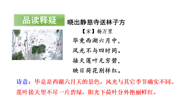 诗的前两句:诗的前两句:质朴无华的诗句,说明六月西湖与其他季节不同的风光,是足可留恋的。这首诗作者写的是晴好天气下西湖中莲荷的壮美。前两句议论,后两句写景,景在议后,目的是突现景美。让我们感受到了诗人对西湖的热爱和赞美之情。诗歌表达了一种什么样的情感?(核心问题)全诗通过对西湖美景的赞美,曲折地表达对友人深情的眷恋。这首诗各描写了哪些景物?在诗中画出来。(串珠问题2)所属专题:晓出净慈寺送林子方ppt。