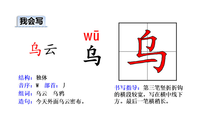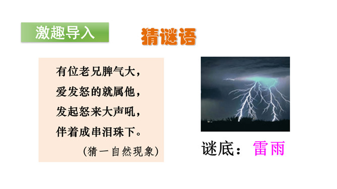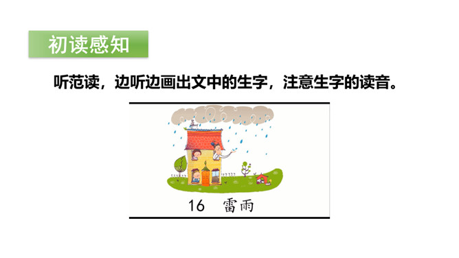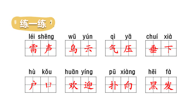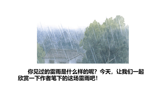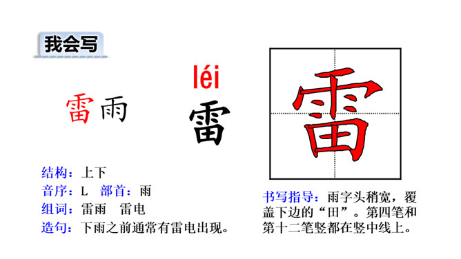 你见过的雷雨是什么样的呢?今天,让我们一起欣赏一下作者笔下的这场雷雨吧!初读课文后,你感受到了什么?示例:初读课文后,我感受到了大自然的神奇与美丽。有感情地朗读课文,读准字音,读通句子。书写指导:雨字头稍宽,覆盖下边的“田”。第四笔和第十二笔竖都在竖中线上。书写指导:第三笔竖折折钩的横段较宽,写在横中线下方。最后一笔横稍长。书写指导:第八笔横比第七笔横稍长,“灬”外面两点稍长,中间两点稍短。所属专题:雷雨ppt。