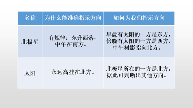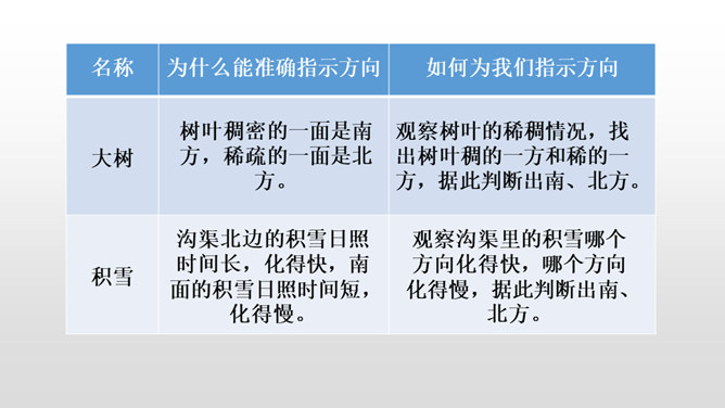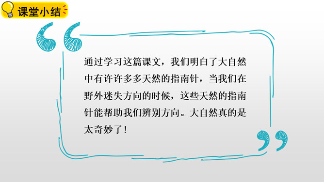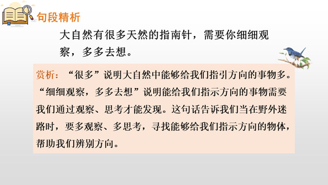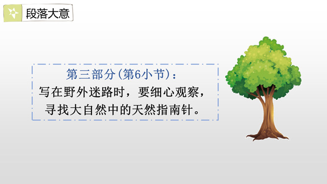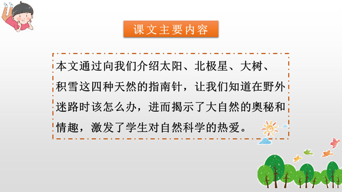 第一部分(第1小节):概括指出在野外迷路时,可利用大自然中的天然指南针辨别方向。第二部分(第2-5小节):具体介绍太阳、北极星、大树、积雪这四种天然指南针是如何指示方向的。第三部分(第6小节):写在野外迷路时,要细心观察,寻找大自然中的天然指南针。本文通过向我们介绍太阳、北极星、大树、积雪这四种天然的指南针,让我们知道在野外迷路时该怎么办,进而揭示了大自然的奧秘和情趣,激发了学生对自然科学的热爱。所属专题:要是你在野外迷了路ppt。