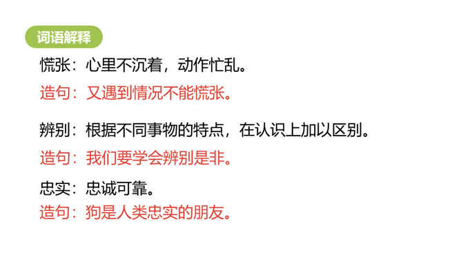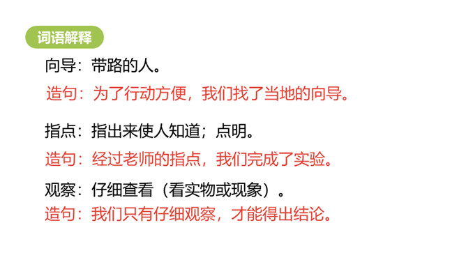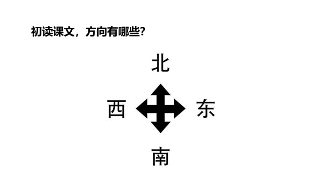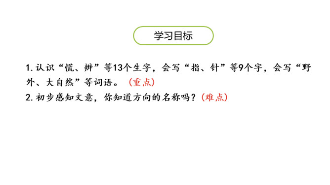 学习目标:1.认识“慌、辨”等13个生字,会写“指、针”等9个字,会写“野外、大自然”等词语。 (重点)2.初步感知文意,你知道方向的名称吗?(难点)风轻轻的,草软软的,花红红的,这样美丽的景色真适合出游!辨别:根据不同事物的特点,在认识上加以区别。造句:我们要学会辨别是非。指点:指出来使人知道;点明。造句:经过老师的指点,我们完成了实验。向导:带路的人。造句:为了行动方便,我们找了当地的向导。所属专题:要是你在野外迷了路ppt。