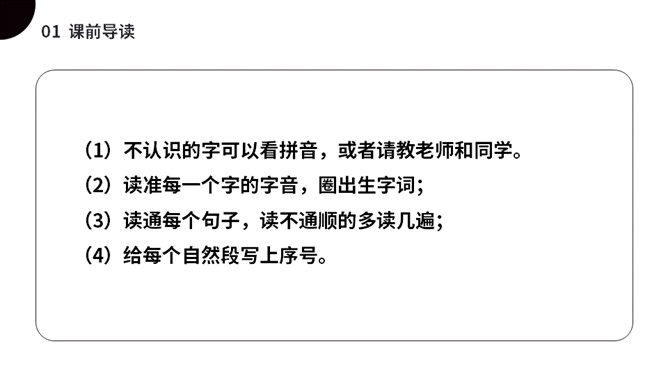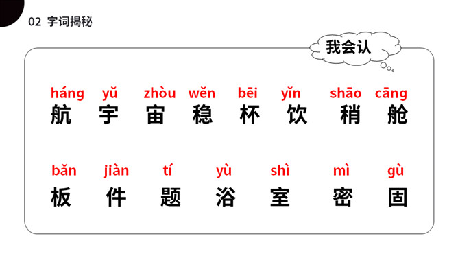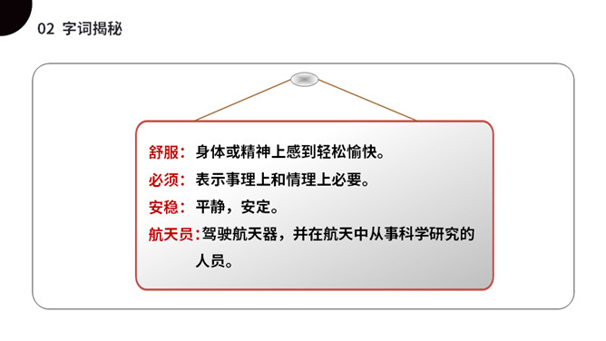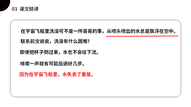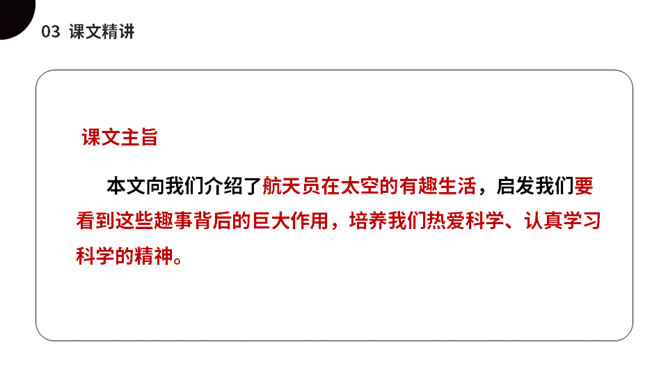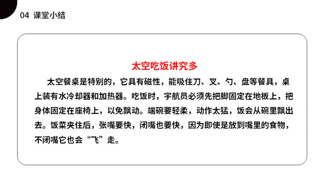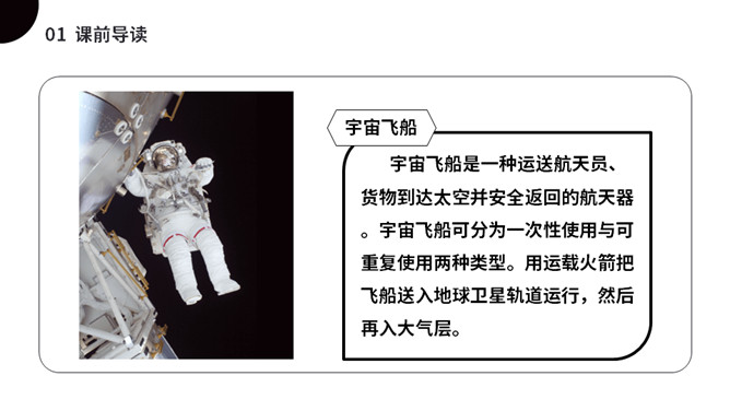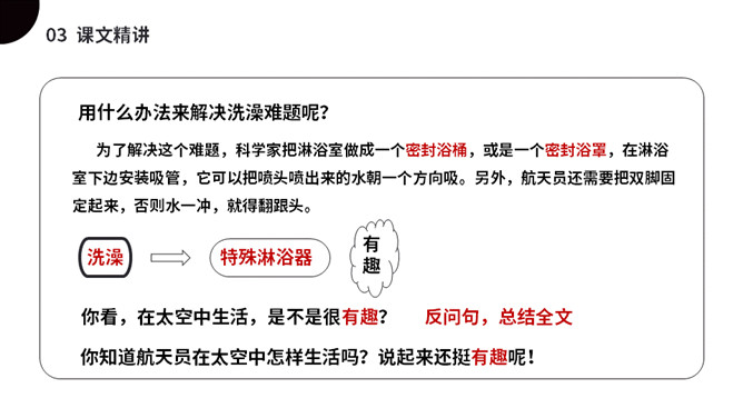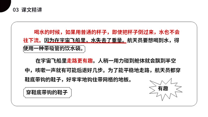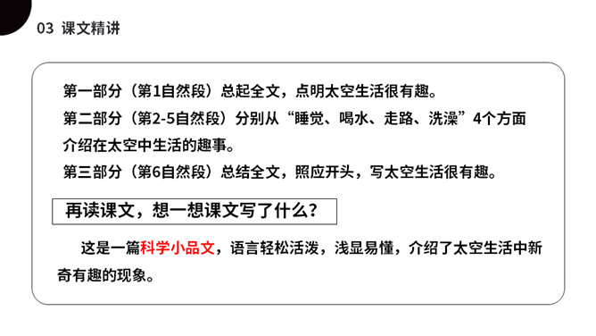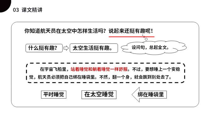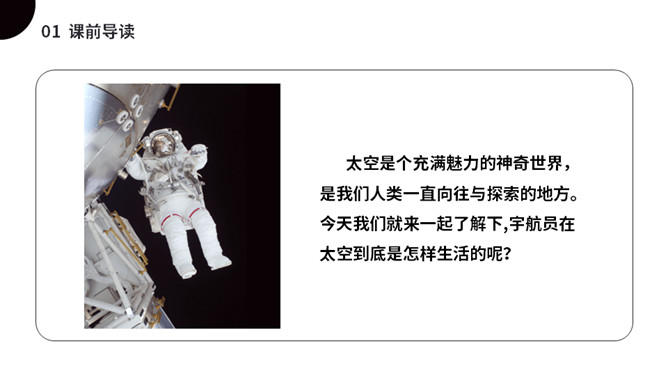 太空是个充满魅力的神奇世界,是我们人类一直向往与探索的地方。今天我们就来一起了解下,宇航员在太空到底是怎样生活的呢?(1)不认识的字可以看拼音,或者请教老师和同学。(2)读准每一个字的字音,圈出生字词;(3)读通每个句子,读不通顺的多读几遍;(4)给每个自然段写上序号。第一部分(第1自然段)总起全文,点明太空生活很有趣。第二部分(第2-5自然段)分别从“睡觉、喝水、走路、洗澡”4个方面介绍在太空中生活的趣事。第三部分(第6自然段)总结全文,照应开头,写太空生活很有趣。所属专题:太空生活趣事多ppt。