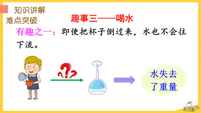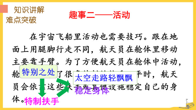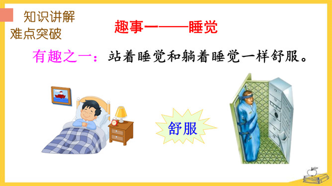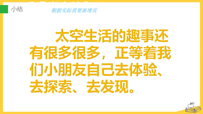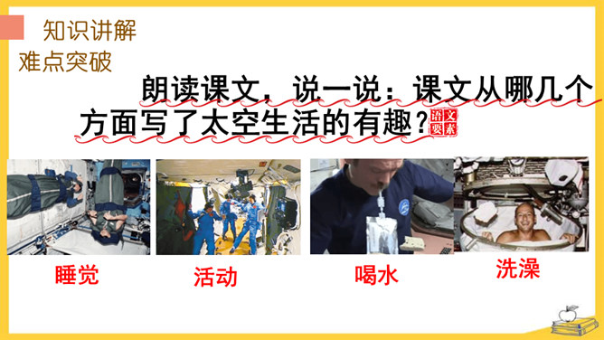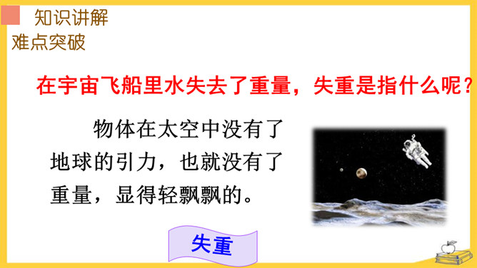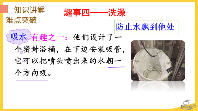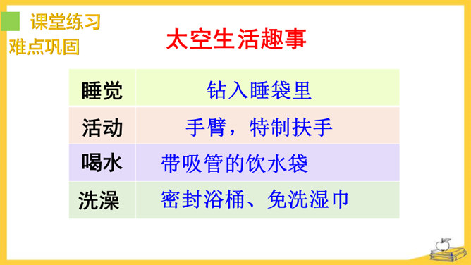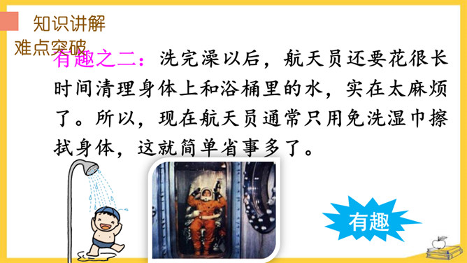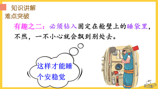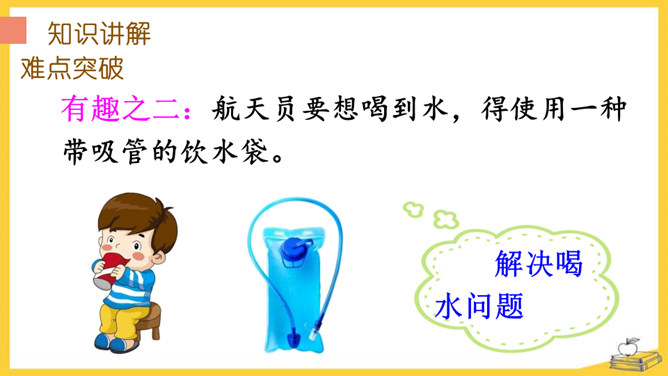有趣之一:站着睡觉和躺着睡觉一样舒服。有趣之二:必须钻入固定在舱壁上的睡袋里,不然,一不小心就会飘到别处去。 有趣之一:即使把杯子倒过来,水也不会往下流。在宇宙飞船里水失去了重量,失重是指什么呢?物体在太空中没有了地球的引力,也就没有了重量,显得轻飘飘的。有趣之二:航天员要想喝到水,得使用一种带吸管的饮水袋。 太空生活的趣事还有很多很多,正等着我们小朋友自己去体验、去探索、去发现。所属专题:太空生活趣事多ppt。