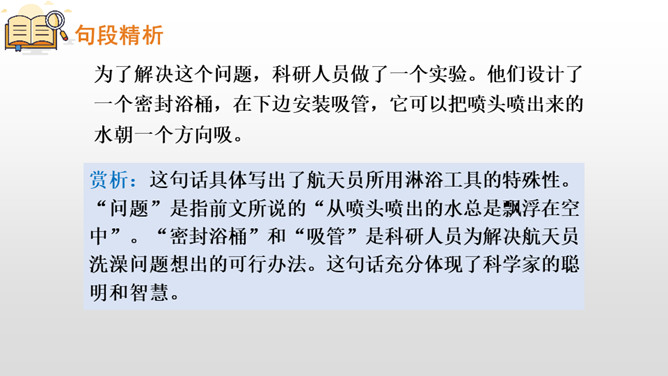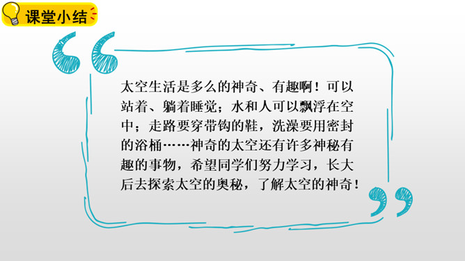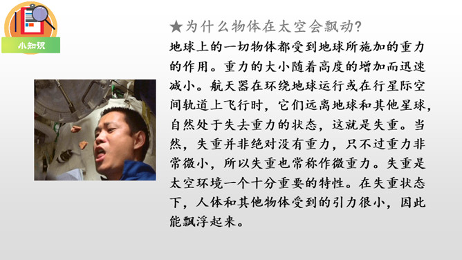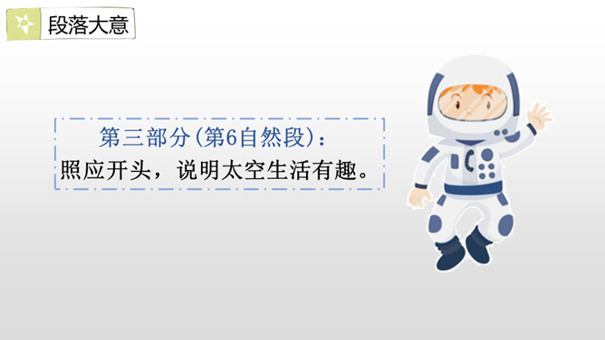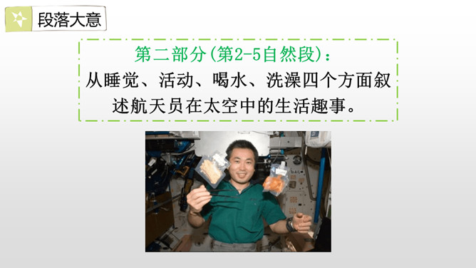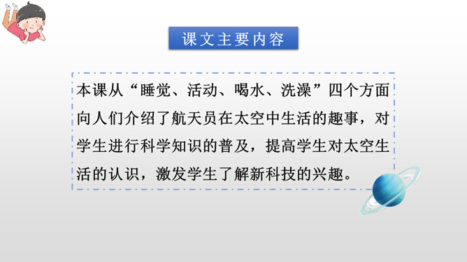 第一部分(第1自然段):总写航天员的太空生活很有趣。第二部分(第2-5自然段):从睡觉、活动、喝水、洗澡四个方面叙述航天员在太空中的生活趣事。第三部分(第6自然段):照应开头,说明太空生活有趣。本课从“睡觉、活动、喝水、洗澡”四个方面向人们介绍了航天员在太空中生活的趣事,对学生进行科学知识的普及,提高学生对太空生活的认识,激发学生了解新科技的兴趣。所属专题:太空生活趣事多ppt。