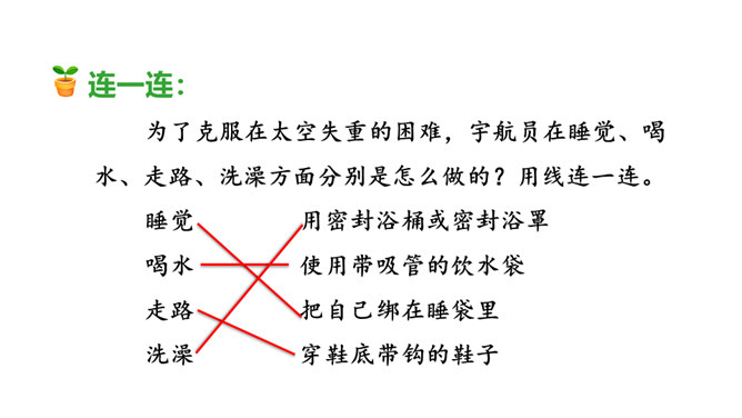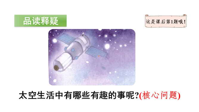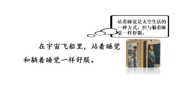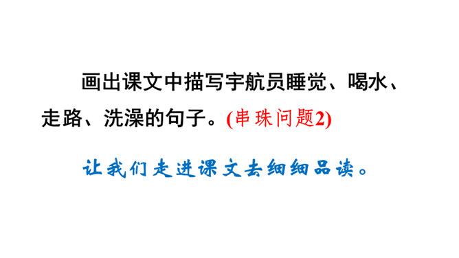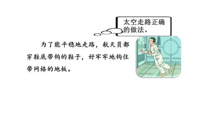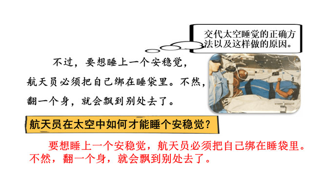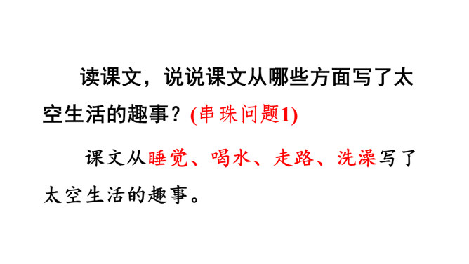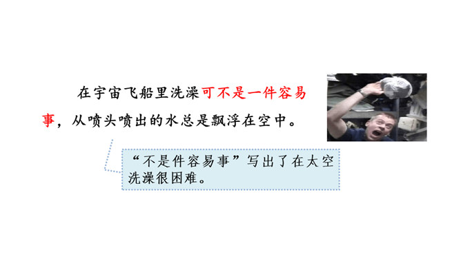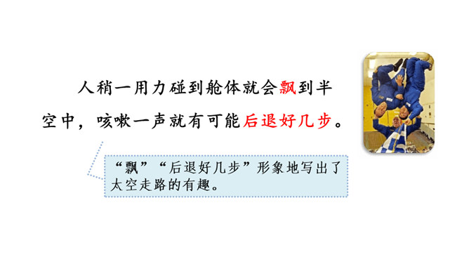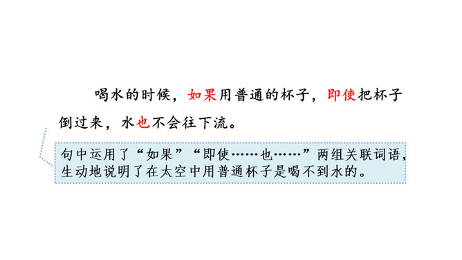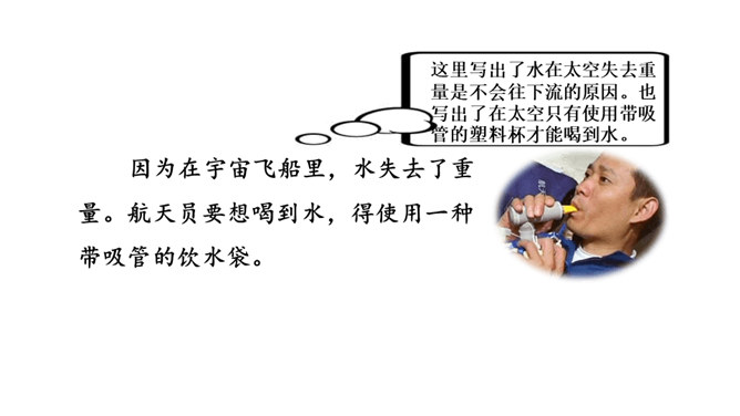 读课文,说说课文从哪些方面写了太空生活的趣事?(串珠问题1)课文从睡觉、喝水、走路、洗澡写了太空生活的趣事。画出课文中描写宇航员睡觉、喝水、走路、洗澡的句子。(串珠问题2)让我们走进课文去细细品读。句中运用了“如果”“即使……也……”两组关联词语,生动地说明了在太空中用普通杯子是喝不到水的。示例:小明学习非常认真,如果作业做不完,即使有非常好玩的游戏,也不会参与。所属专题:太空生活趣事多ppt。