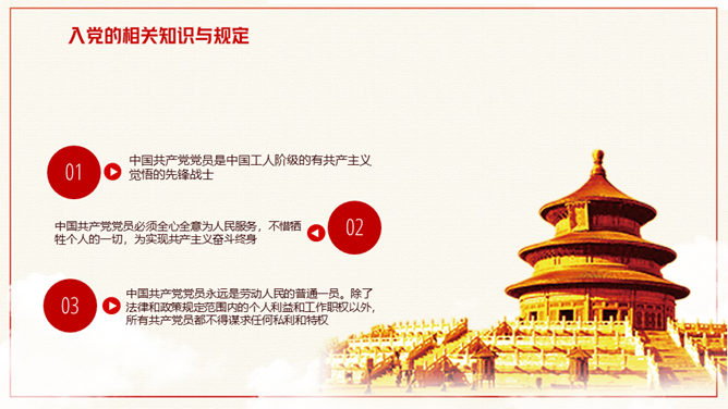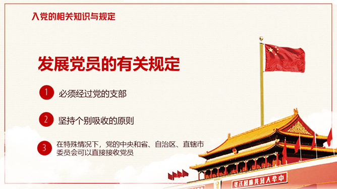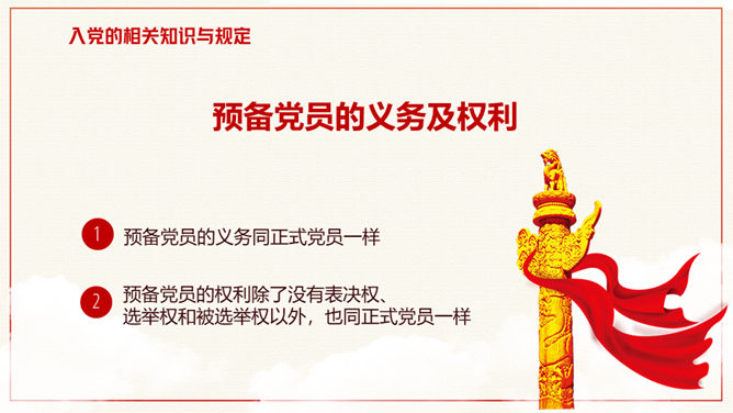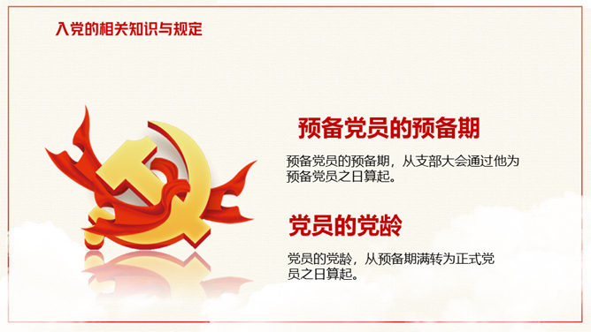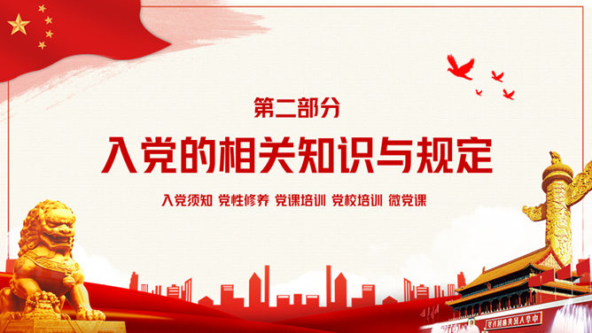 积极分子入党知识培训PPT模板。入党的相关知识与规定、共产党的权利和义务、党的纪律、新时代合格党员一定要不忘初心牢记使命。