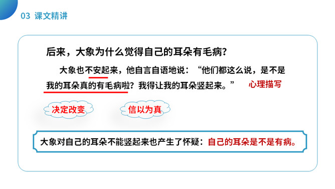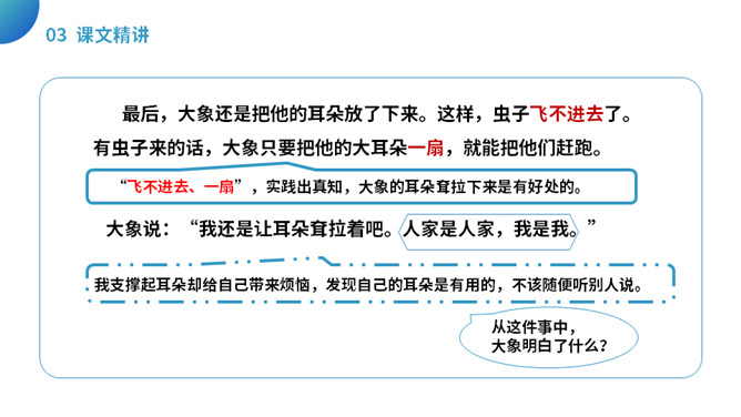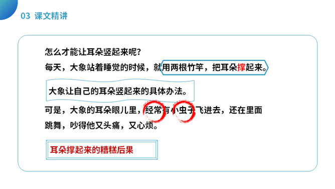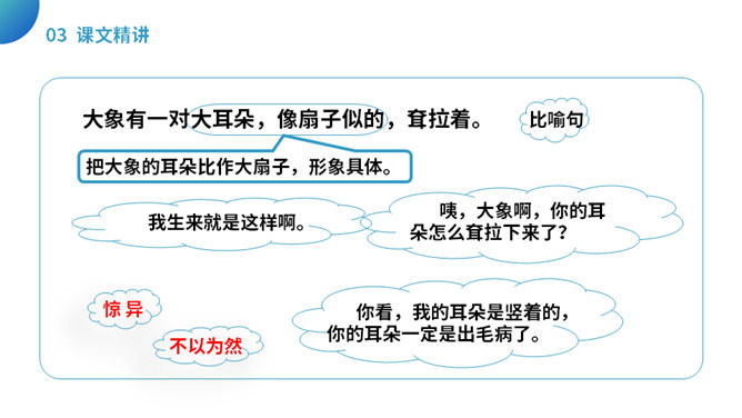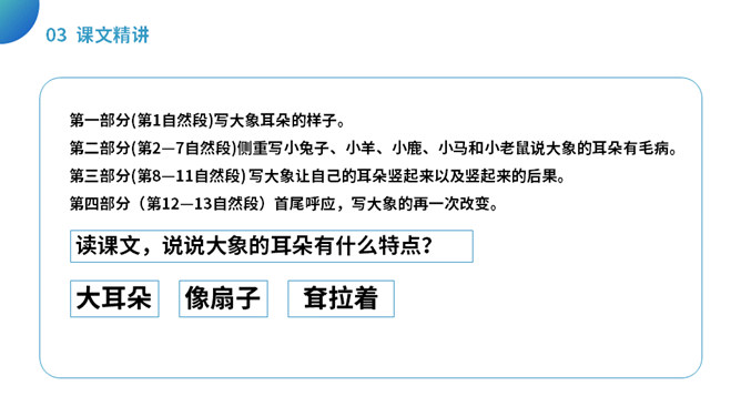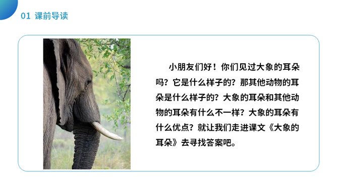 小朋友们好!你们见过大象的耳朵吗?它是什么样子的?那其他动物的耳朵是什么样子的?大象的耳朵和其他动物的耳朵有什么不一样?大象的耳朵有什么优点?就让我们走进课文去寻找答案吧。(1)不认识的字可以看拼音,或者请教老师和同学。(2)读准每一个字的字音,圈出生字词;(3)读通每个句子,读不通顺的多读几遍;(4)给每个自然段写上序号。再读课文,想一想课文写了什么?所属专题:大象的耳朵ppt。