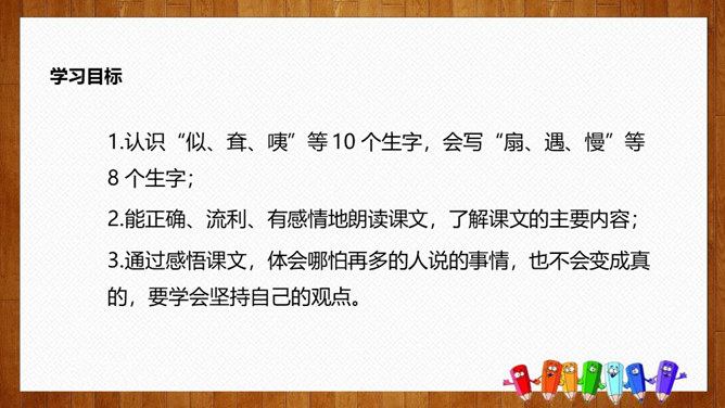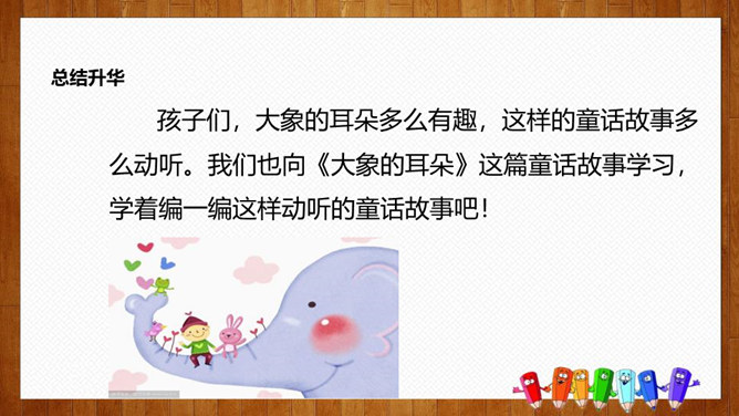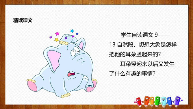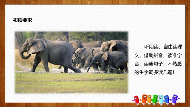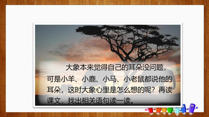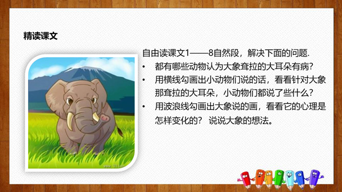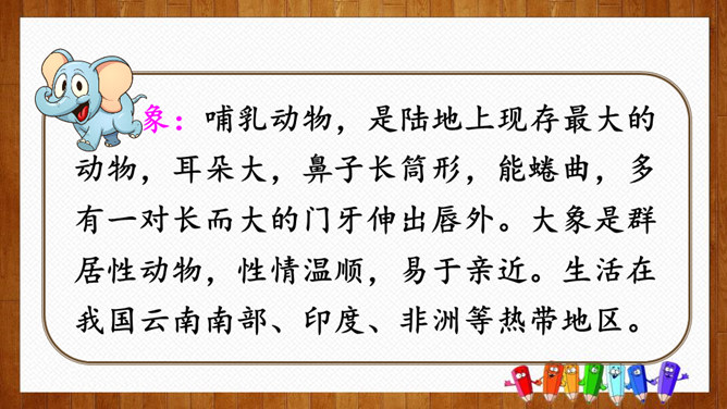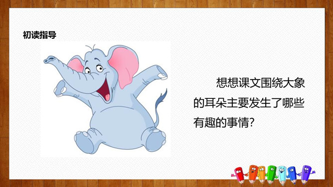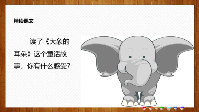 1.认识“似、耷、咦”等 10 个生字,会写“扇、遇、慢”等 8 个生字;2.能正确、流利、有感情地朗读课文,了解课文的主要内容;3.通过感悟课文,体会哪怕再多的人说的事情,也不会变成真的,要学会坚持自己的观点。同学们,你们喜欢动物吗?都喜欢些什么动物?它们都有些什么特点?听朗读,自由读课文。借助拼音,读准字音,读通句子,不熟悉的生字词多读几遍!想想课文围绕大象的耳朵主要发生了哪些有趣的事情?所属专题:大象的耳朵ppt。