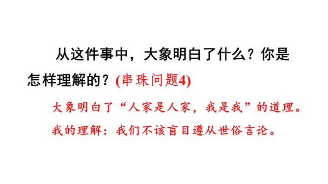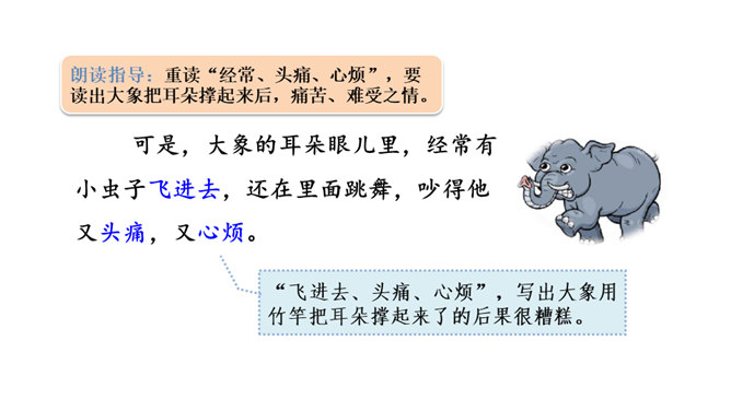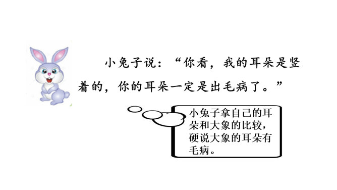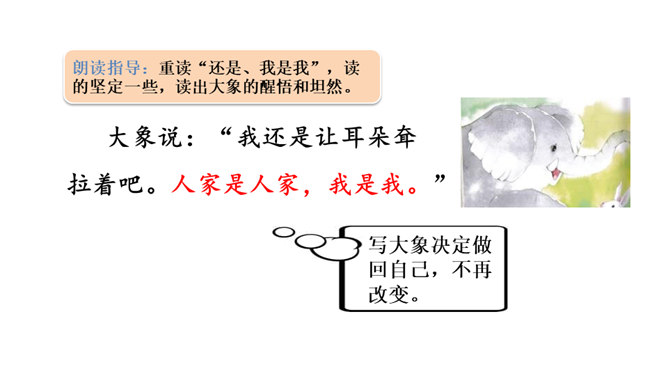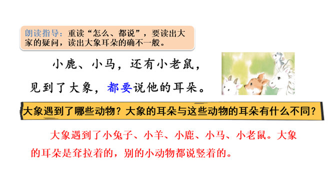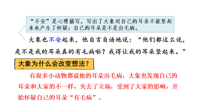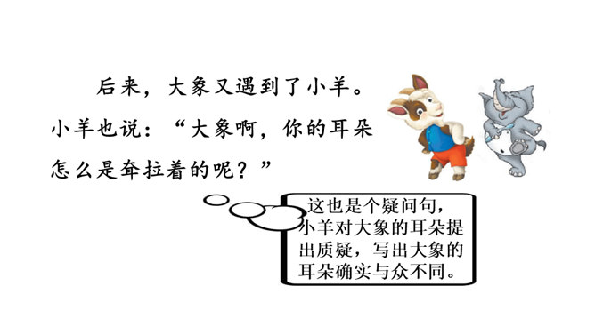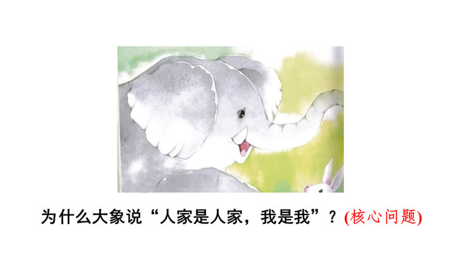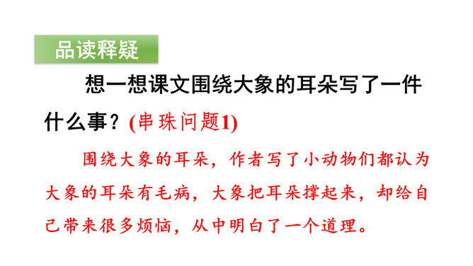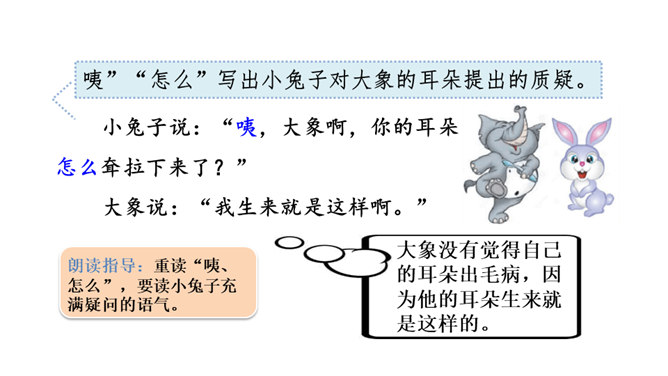 想一想课文围绕大象的耳朵写了一件什么事?(串珠问题1)围绕大象的耳朵,作者写了小动物们都认为大象的耳朵有毛病,大象把耳朵撑起来,却给自己带来很多烦恼,从中明白了一个道理。大象为什么觉得自己的耳朵有毛病?(串珠问题2)让我们走进课文去细细品读。朗读指导:重读“咦、怎么”,要读小兔子充满疑问的语气。大象没有觉得自己的耳朵出毛病,因为他的耳朵生来就是这样的。所属专题:大象的耳朵ppt。