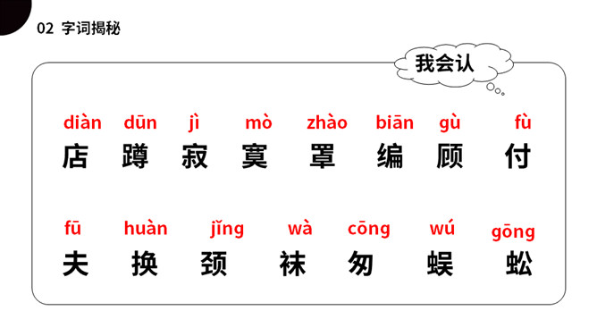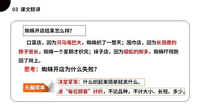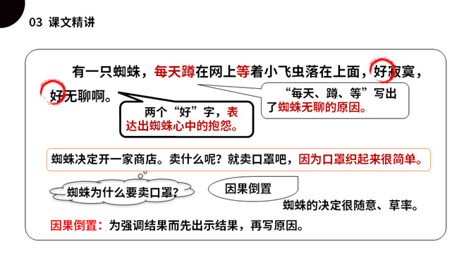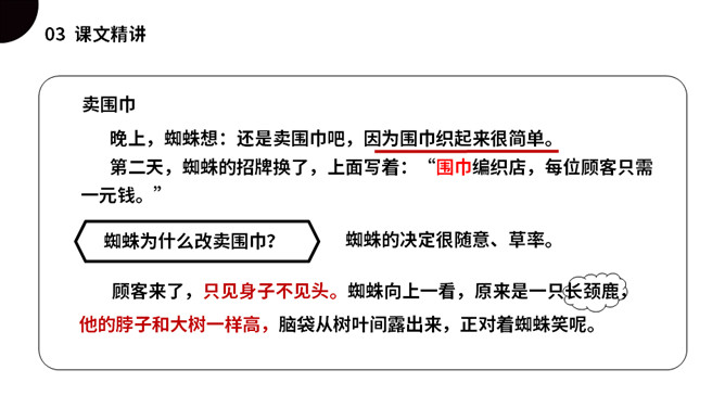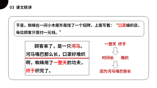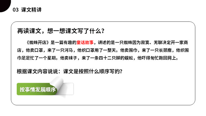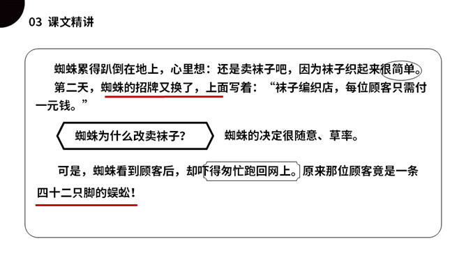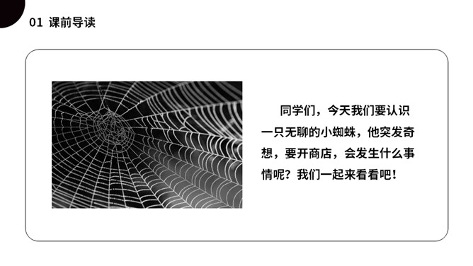 同学们,今天我们要认识一只无聊的小蜘蛛,他突发奇想,要开商店,会发生什么事情呢?我们一起来看看吧!(1)不认识的字可以看拼音,或者请教老师和同学。(2)读准每一个字的字音,圈出生字词;(3)读通每个句子,读不通顺的多读几遍;(4)给每个自然段写上序号。是一篇有趣的童话故事,讲述的是一只蜘蛛因为寂寞、无聊决定开一家商店,他卖口罩,来了一只河马,他织口罩用了一整天。他卖围巾,来了一只长颈鹿,他织围巾足足忙了一个星期。他卖袜子,来了一条四十二只脚的蜈蚣,他吓得匆忙跑回网上。所属专题:蜘蛛开店ppt。