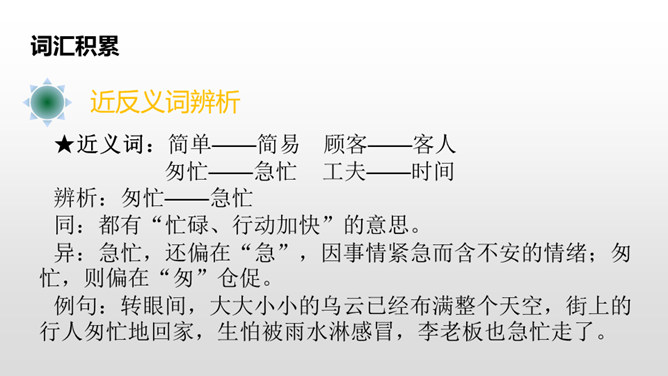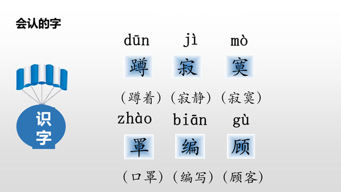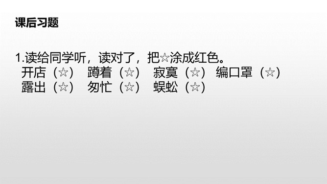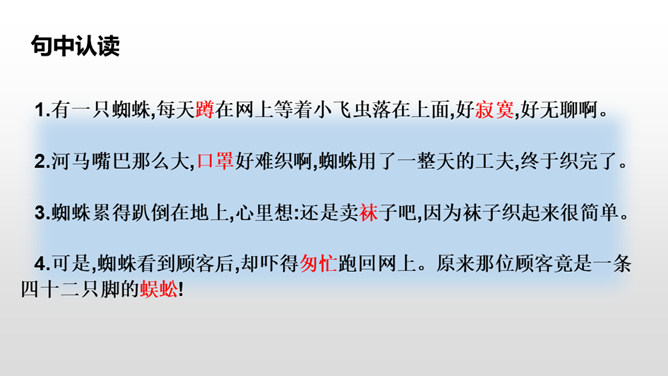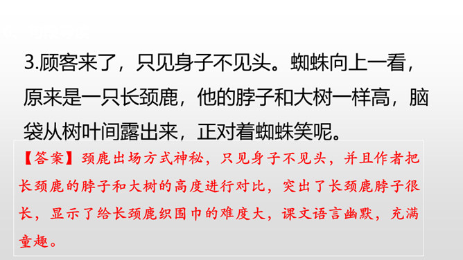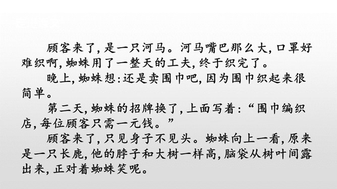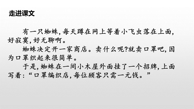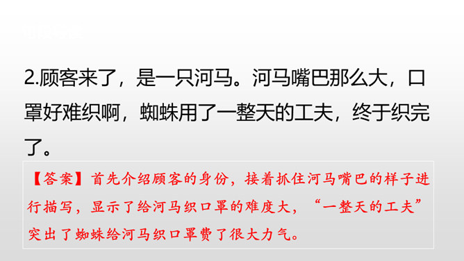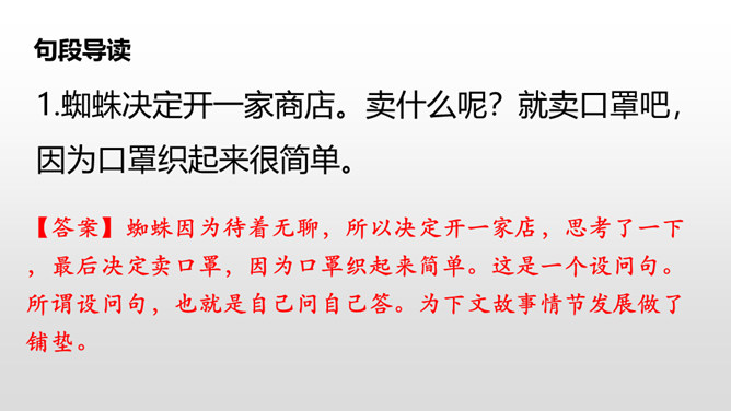 1.蜘蛛决定开一家商店。卖什么呢?就卖口罩吧,因为口罩织起来很简单。【答案】蜘蛛因为待着无聊,所以决定开一家店,思考了一下,最后决定卖口罩,因为口罩织起来简单。这是一个设问句。所谓设问句,也就是自己问自己答。为下文故事情节发展做了铺垫。2.顾客来了,是一只河马。河马嘴巴那么大,口罩好难织啊,蜘蛛用了一整天的工夫,终于织完了。【答案】首先介绍顾客的身份,接着抓住河马嘴巴的样子进行描写,显示了给河马织口罩的难度大,“一整天的工夫”突出了蜘蛛给河马织口罩费了很大力气。所属专题:蜘蛛开店ppt。