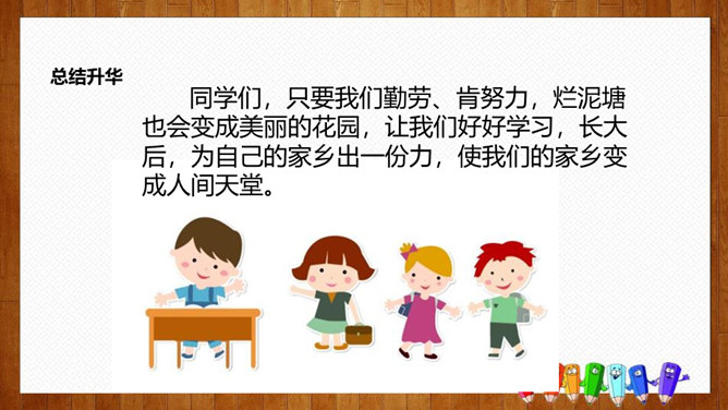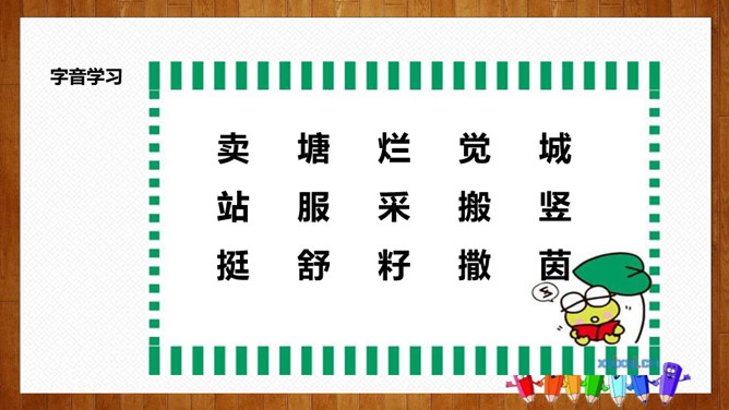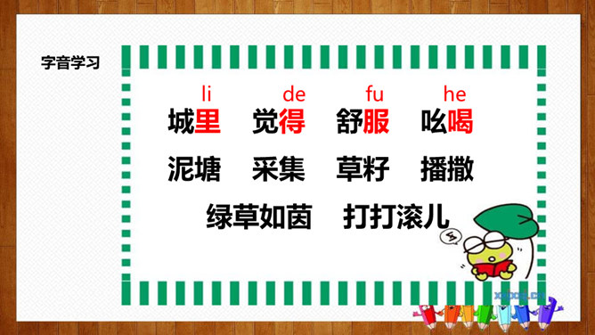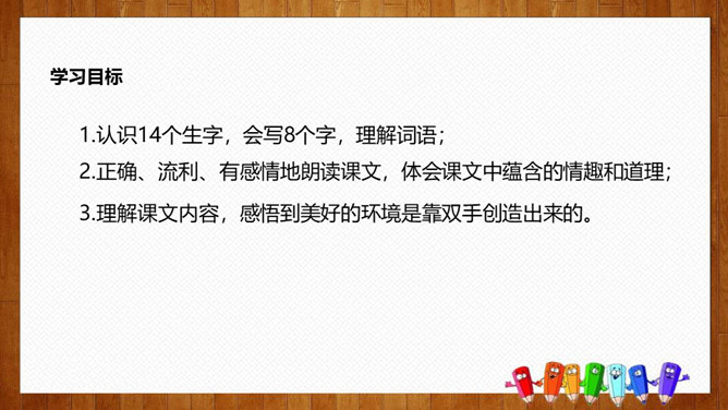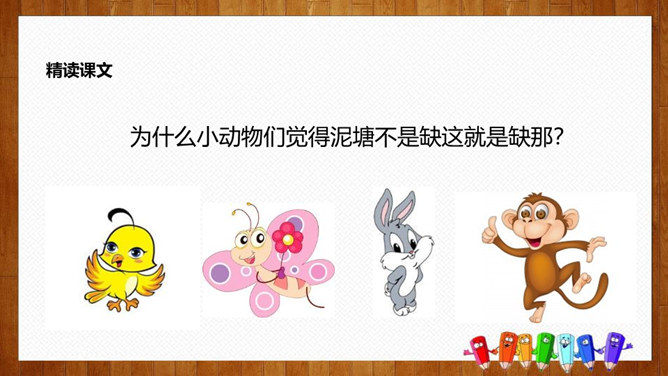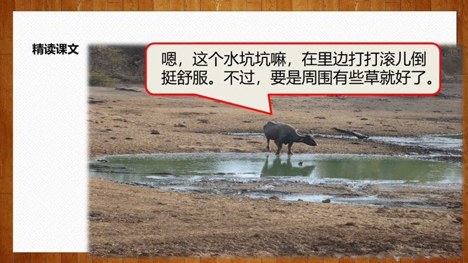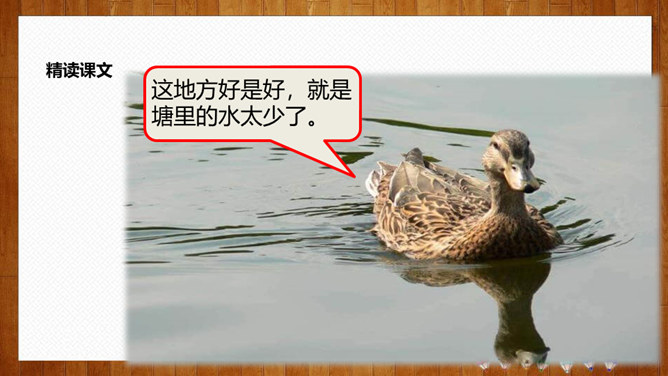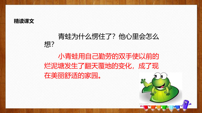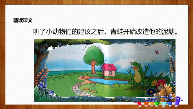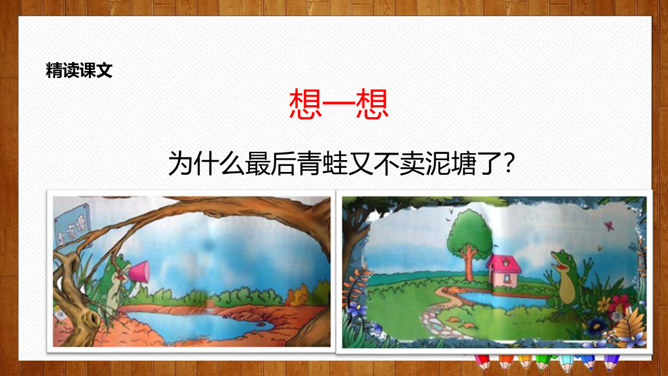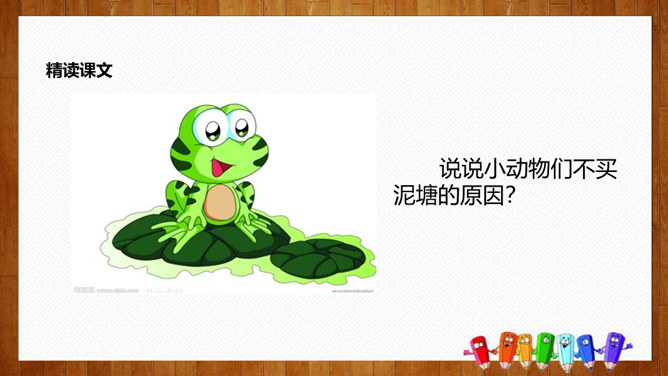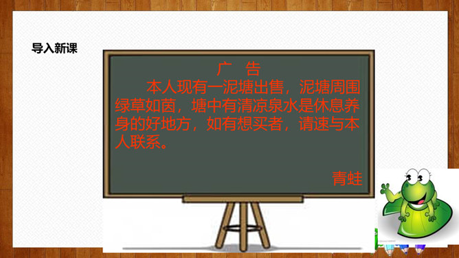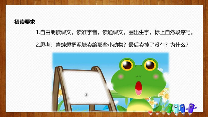 学习目标:1.认识14个生字,会写8个字,理解词语;2.正确、流利、有感情地朗读课文,体会课文中蕴含的情趣和道理;3.理解课文内容,感悟到美好的环境是靠双手创造出来的。初读要求:1.自由朗读课文,读准字音,读通课文,圈出生字,标上自然段序号。2.思考:青蛙想把泥塘卖给那些小动物?最后卖掉了没有?为什么?说说小动物们不买泥塘的原因?青蛙为什么愣住了?他心里会怎么想?所属专题:青蛙卖泥塘ppt。