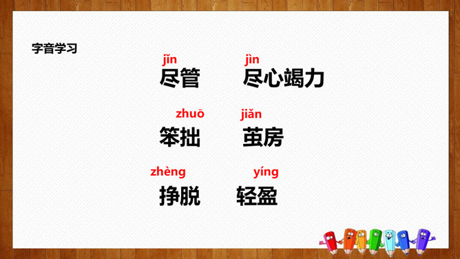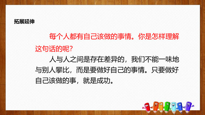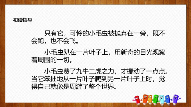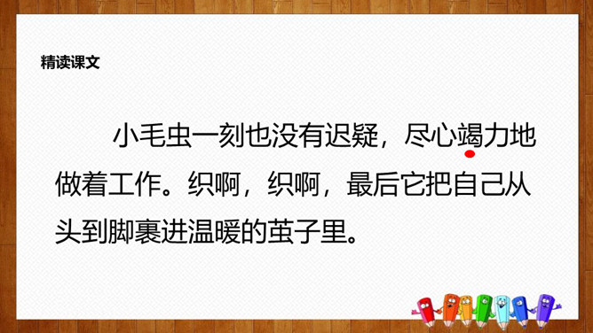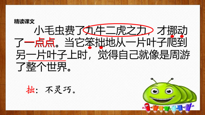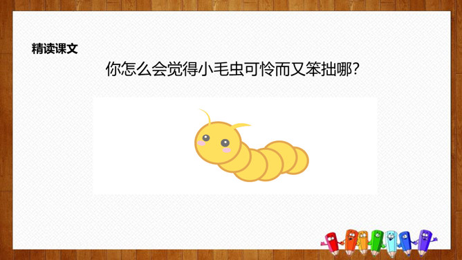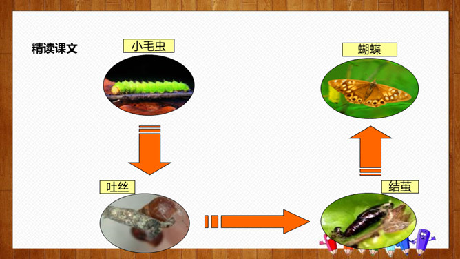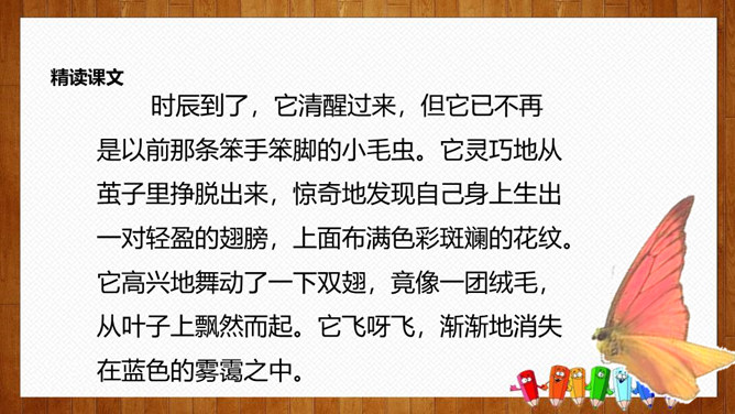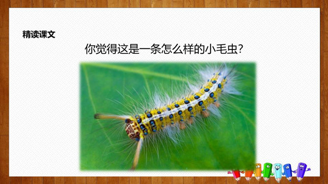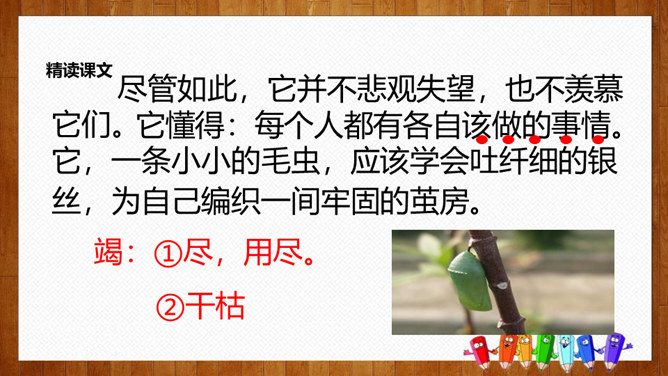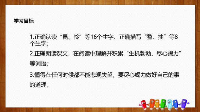 学习目标:1.正确认读“昆、怜”等16个生字、正确描写“整、抽”等8个生字;2.正确朗读课文,在阅读中理解并积累“生机勃勃、尽心竭力”等词语;3.懂得在任何时候都不能悲观失望,要尽心竭力做好自己的事的道理。每个人都有自己该做的事情。你是怎样理解这句话的呢?人与人之间是存在差异的,我们不能一味地与别人攀比,而是要做好自己的事情。只要做好自己该做的事,就是成功。同学们,在生活中还有很多破茧成蝶的故事,请你们课后去找一找,与爸爸妈妈分享。所属专题:小毛虫ppt。