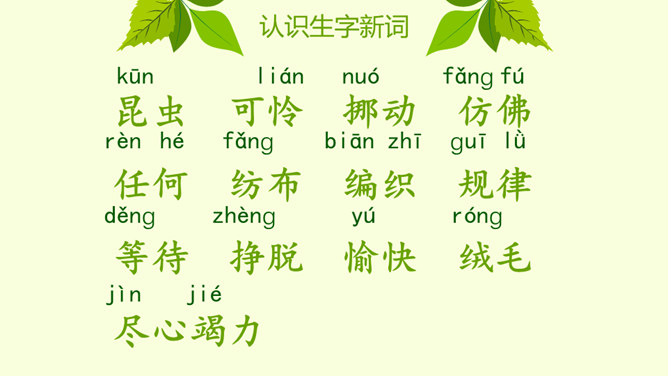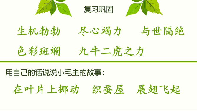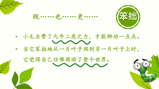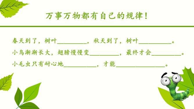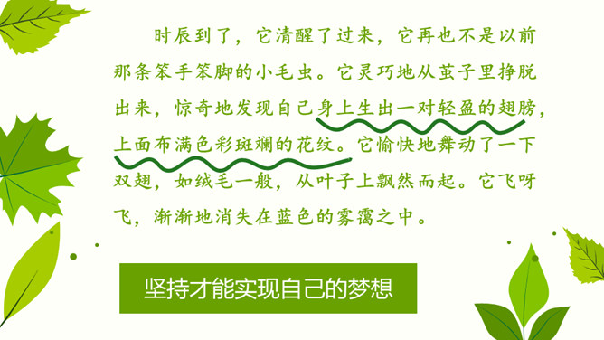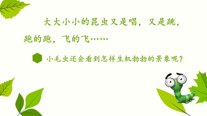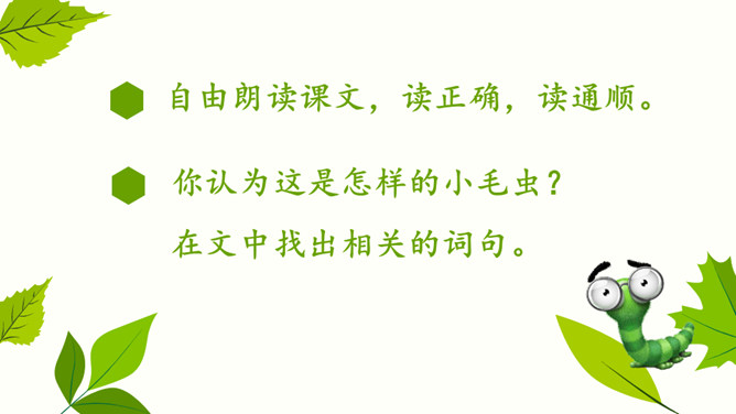 自由朗读课文,读正确,读通顺。你认为这是怎样的小毛虫?在文中找出相关的词句。小毛虫还会看到怎样生机勃勃的景象呢?小毛虫并不悲观失望,也不羡慕任何人。他怎么想的?又做了些什么?用自己的话说说小毛虫的故事。坚持才能实现自己的梦想。所属专题:小毛虫ppt。
