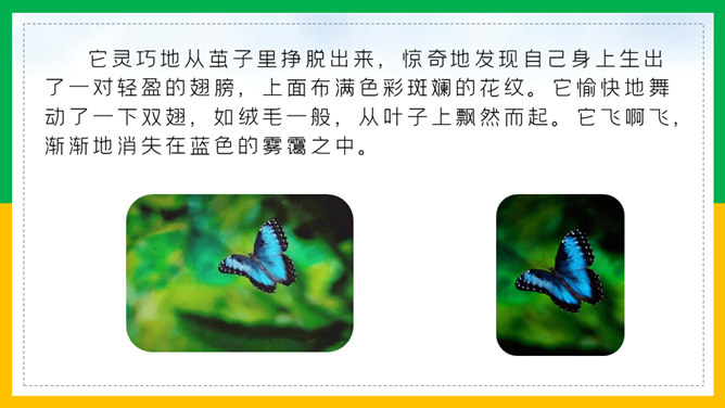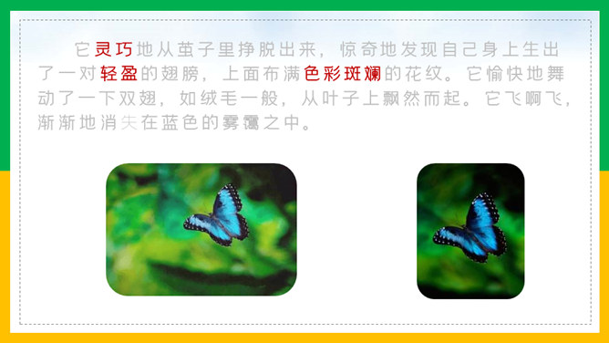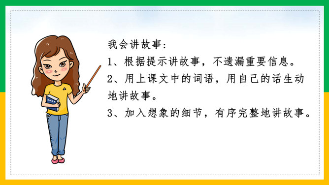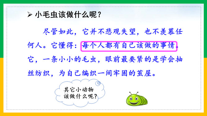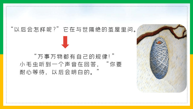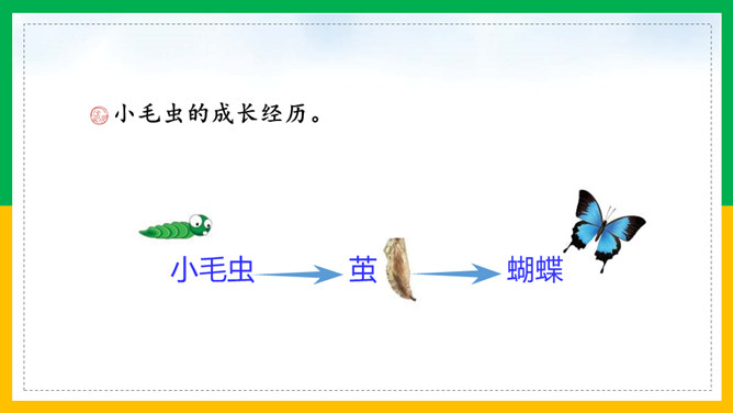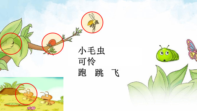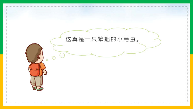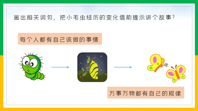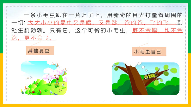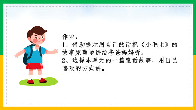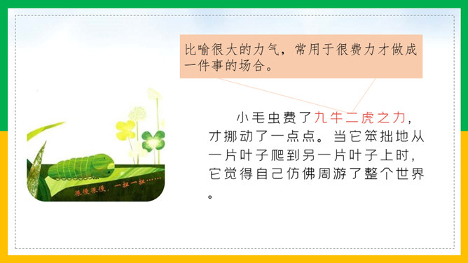 我会讲故事:1、根据提示讲故事,不遗漏重要信息。2、用上课文中的词语,用自己的话生动地讲故事。3、加入想象的细节,有序完整地讲故事。作业:1、借助提示用自己的话把《小毛虫》的故事完整地讲给爸爸妈妈听。2、选择本单元的一篇童话故事,用自己喜欢的方式讲。画出相关词句,把小毛虫经历的变化借助提示讲个故事?比喻很大的力气,常用于很费力才做成一件事的场合。所属专题:小毛虫ppt。