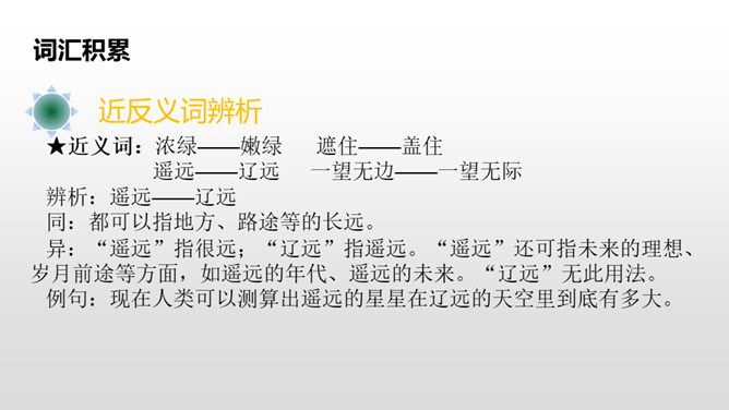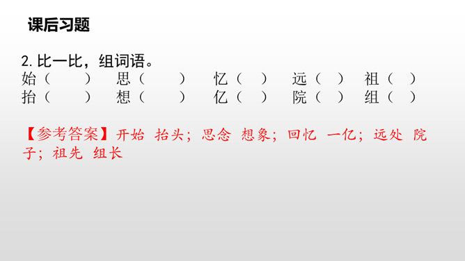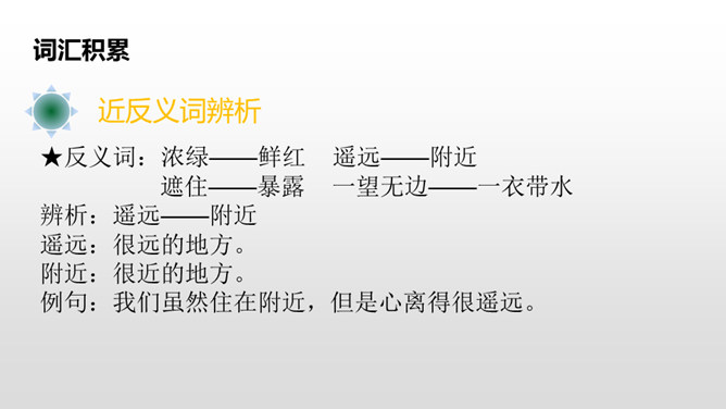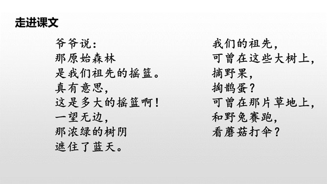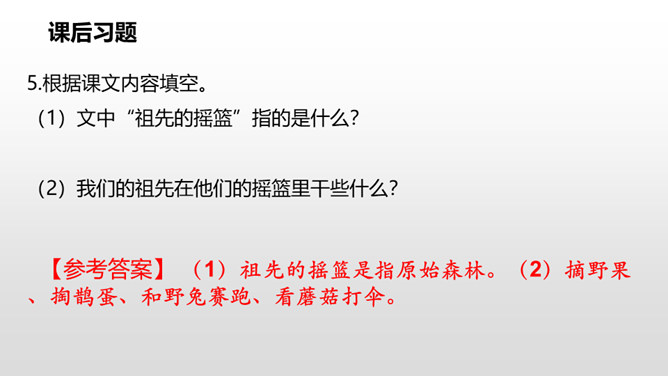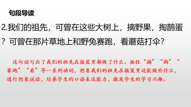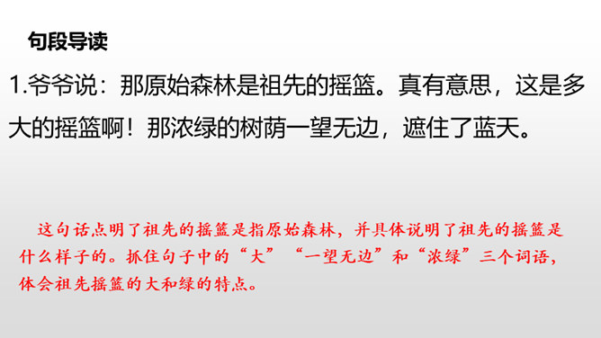 这句话点明了祖先的摇篮是指原始森林,并具体说明了祖先的摇篮是什么样子的。抓住句子中的“大” “一望无边”和“浓绿”三个词语,体会祖先摇篮的大和绿的特点。这句话写出了我们的祖先在摇篮里都做了什么。抓住“摘”“掏”“赛跑”“看”等一系列动词,想象我们的祖先在摇篮里还能做些什么,进行想象说话,培养学生的口语表达能力,激发学生的学习兴趣。这句话要抓住“美好”和“遥远”两个词语去体会。所属专题:祖先的摇篮ppt。