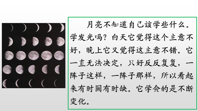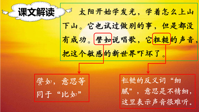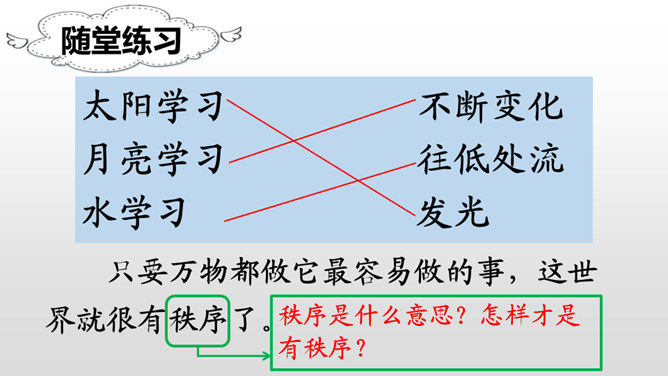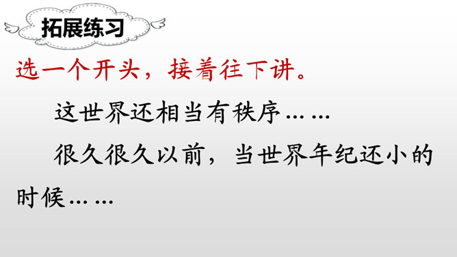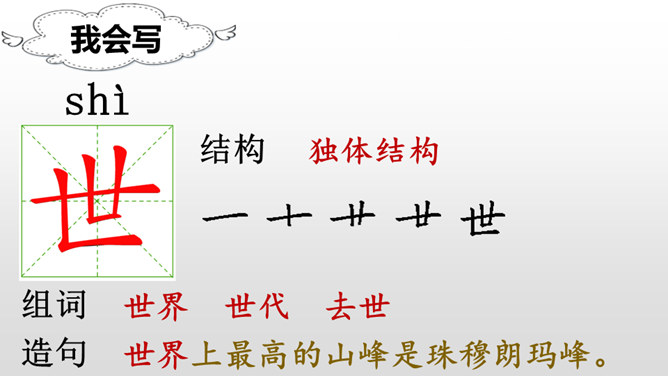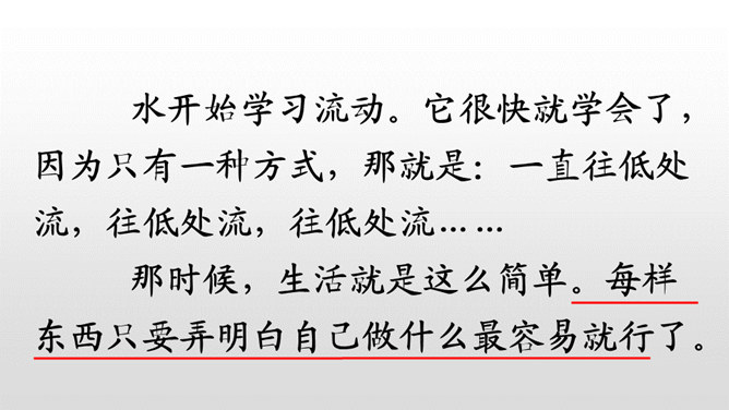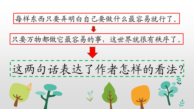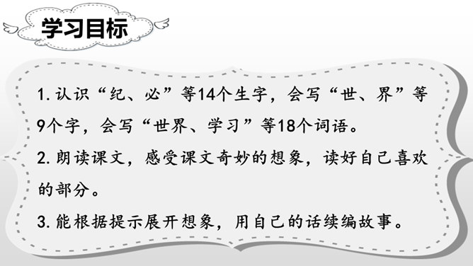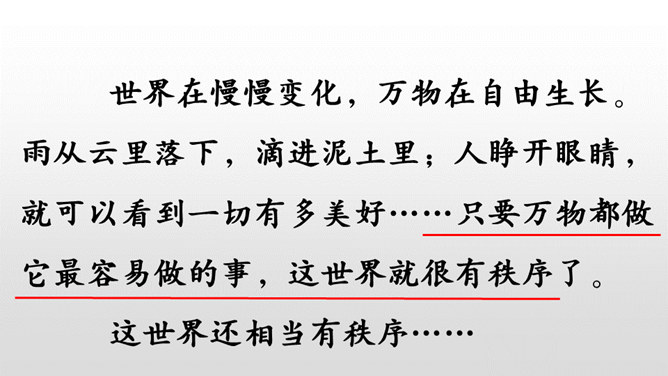 学习目标:朗读课文,感受课文奇妙的想象,读好自己喜欢的部分。认识“纪、必”等14个生字,会写“世、界”等9个字,会写“世界、学习”等18个词语。能根据提示展开想象,用自己的话续编故事。听朗读,然后自己试着读一读,注意读准字音,不会的字多读几遍!这两句话表达了作者怎样的看法?如果每个人都做自己最容易的事,这世界是不是也相当有秩序呢?我们总是努力勉励自己去克服万重困难,去做自己其实并没有天赋的十分痛苦的事,而往往不去想是否是从自己的实际出发。所属专题:当世界年纪还小的时候ppt。