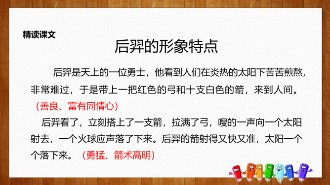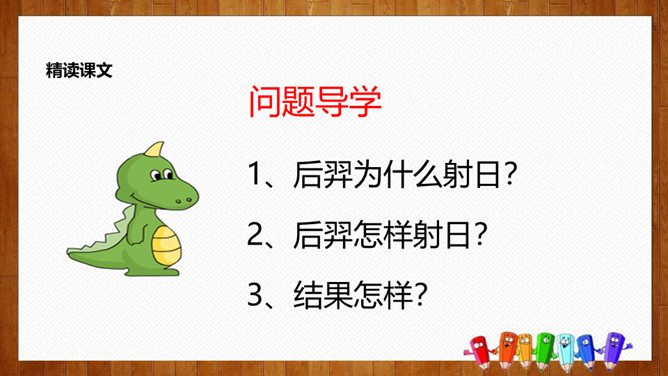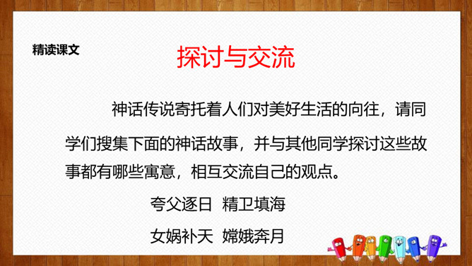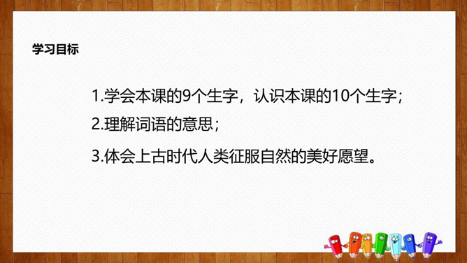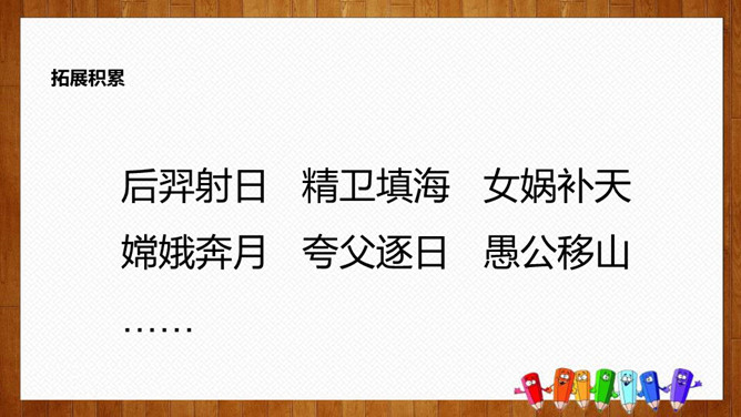学习目标:1.学会本课的9个生字,认识本课的10个生字;2.理解词语的意思;3.体会上古时代人类征服自然的美好愿望。同学们,你们喜欢听神话故事吗?你们知道下图讲的是什么神话故事吗?整体感知,理解课文内容,了解后羿射日的原因。神话传说寄托着人们对美好生活的向往,请同学们搜集下面的神话故事,并与其他同学探讨这些故事都有哪些寓意,相互交流自己的观点。所属专题:羿射九日ppt。