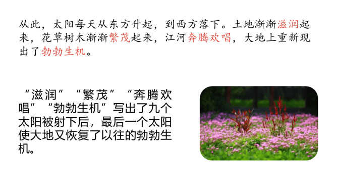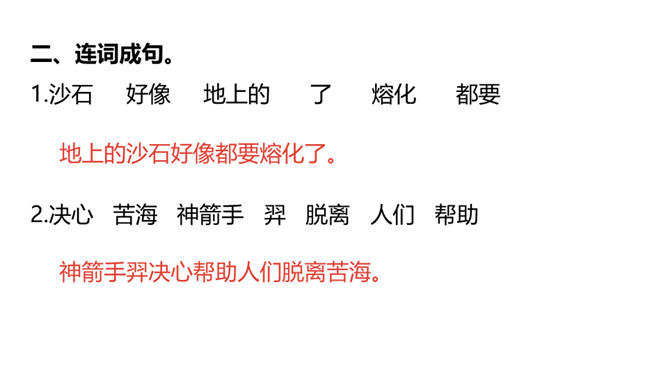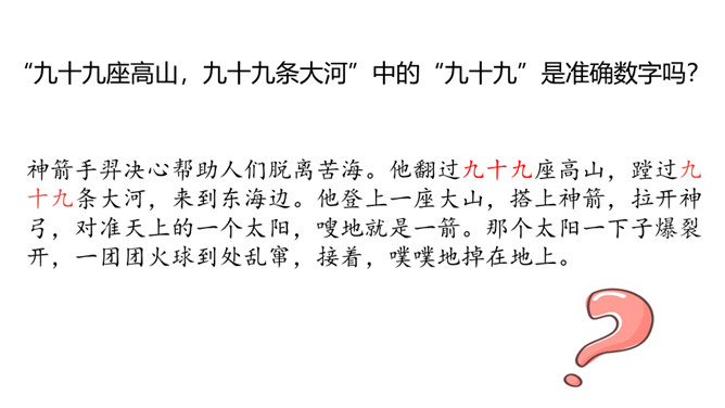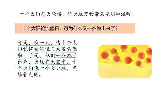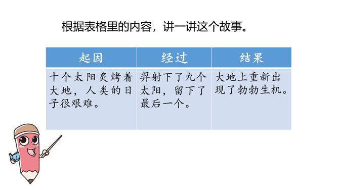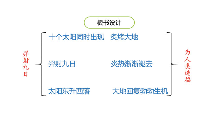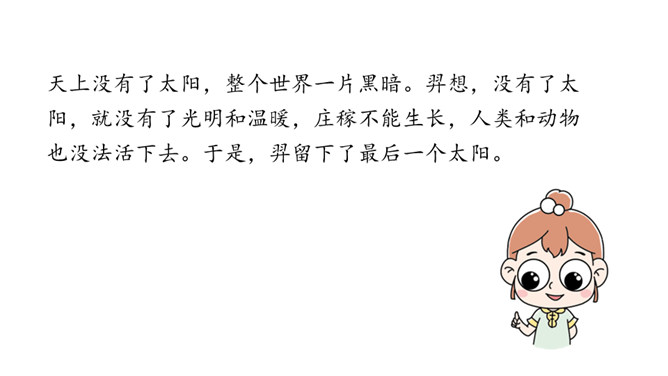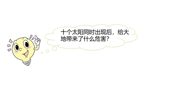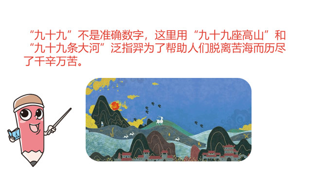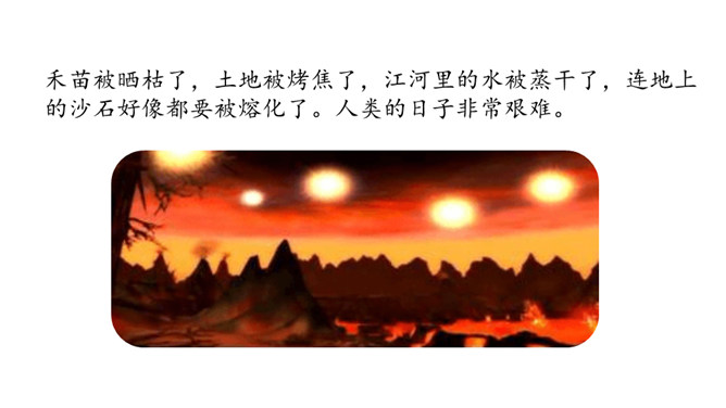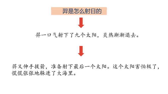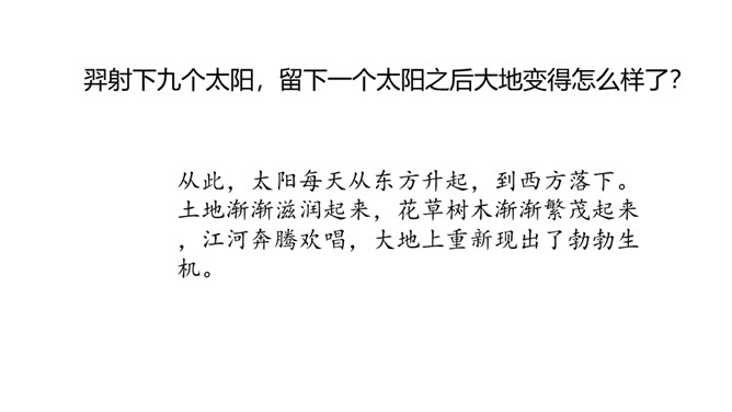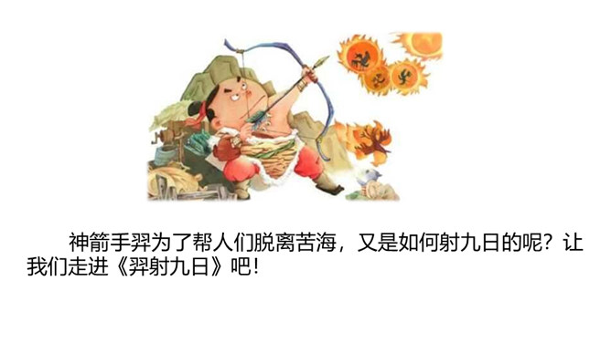学习目标:1.能够根据表格提示的内容讲故事。 2.能就自己觉得神奇的内容和同学交流。神箭手羿为了帮人们脱离苦海,又是如何射九日的呢?让我们走进《羿射九日》吧!十个太阳同时出现后,给大地带来了什么危害?“九十九”不是准确数字,这里用“九十九座高山”和“九十九条大河”泛指羿为了帮助人们脱离苦海而历尽了千辛万苦。本文讲述了天上同时出现了十个太阳,世间万物陷入了灾难之中,羿为了帮人们脱离苦海,一口气射掉了九个太阳,留下最后一个太阳让其造福人类的故事。表现了羿无私奉献的精神,体现了上古时代人类征服自然的美好愿望。所属专题:羿射九日ppt。