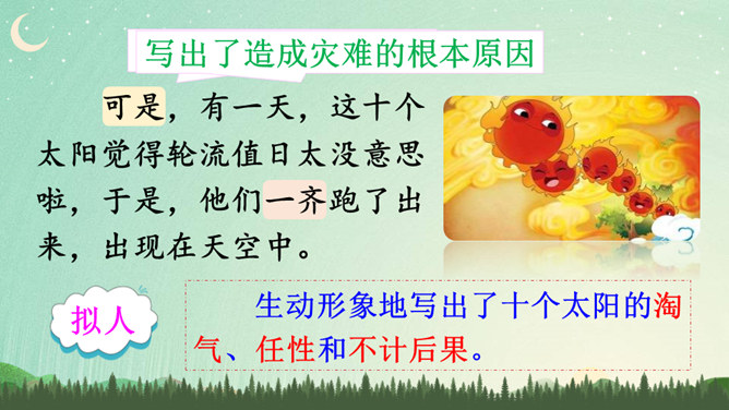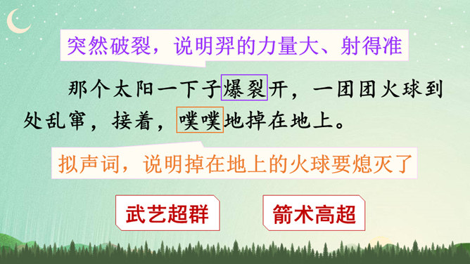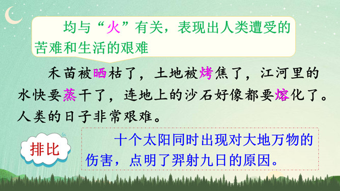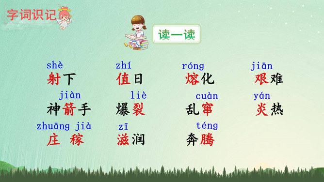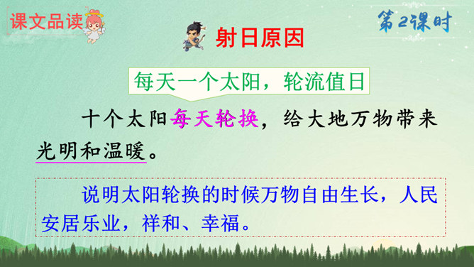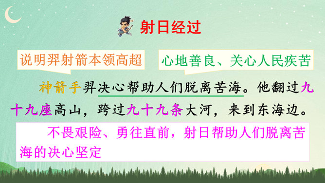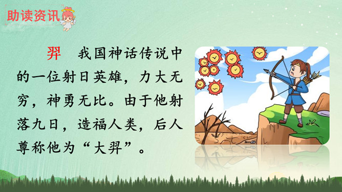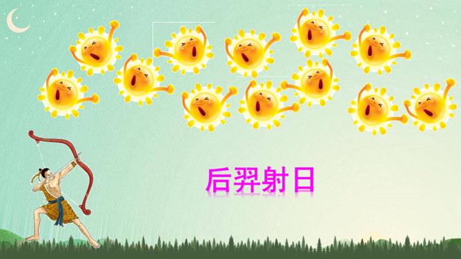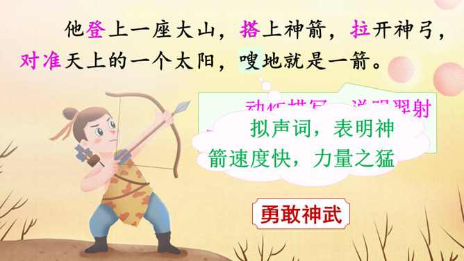 说明太阳轮换的时候万物自由生长,人民安居乐业,祥和、幸福。生动形象地写出了十个太阳的淘气、任性和不计后果。十个太阳同时出现对大地万物的伤害,点明了羿射九日的原因。这篇神话故事讲述了古时候天上的十个太阳给人类带来了沉重的苦难,羿为了帮助人们脱离苦海,历尽艰辛射下九个太阳的故事,刻画了羿刚毅有力、英勇无畏的英雄形象。默读指导:默读时做到不出声读,不动嘴唇,不用手指着读,还要边读边思考,提取信息,使默读真实有效。所属专题:羿射九日ppt。