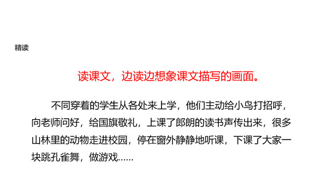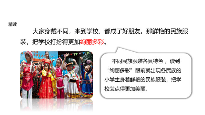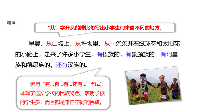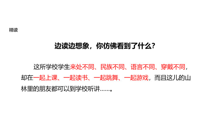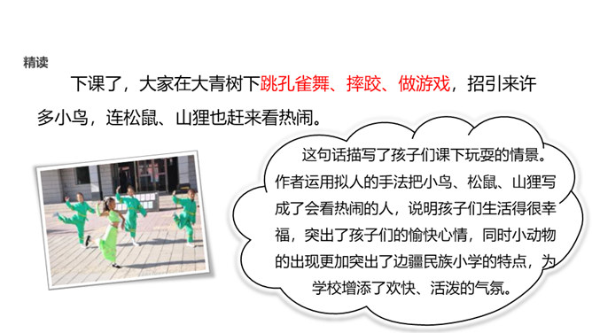 课文通过描写边疆的一所民族小学,反映了孩子们幸福的学习生活,体现了祖国各民族之间的友爱和团结,同时也抒发了作者对民族小学的自豪与赞美之情。这篇课文通过描写边疆的一所民族小学,孩子们幸福的学习生活的情景,让我们体会到了祖国各民族之间的友爱和团结之情。在体会课文思想感情的同时,我学习了边读课文边想象画面,联系上下文理解词语、句子的方法。小组成员互相说说:读到这些词句你眼前出现的画面?让我们走进课文去细细品读。所属专题:大青树下的小学ppt。