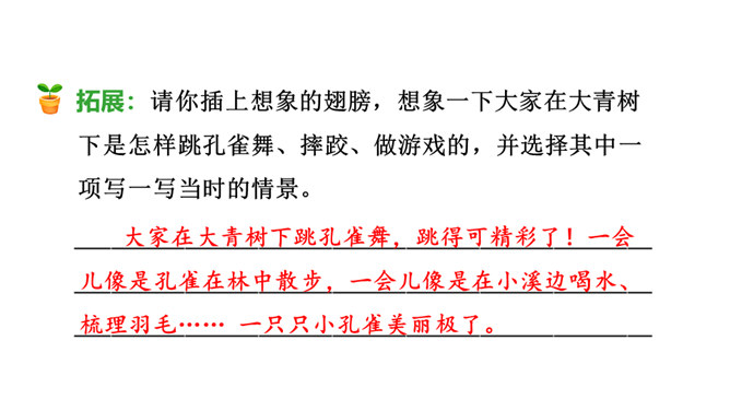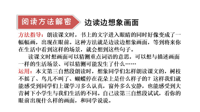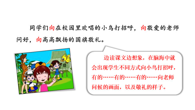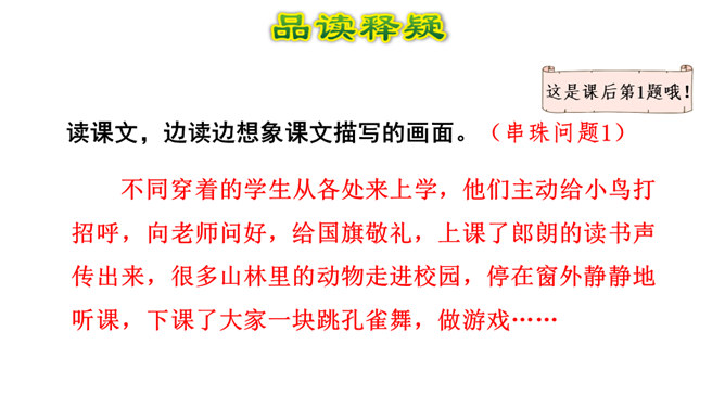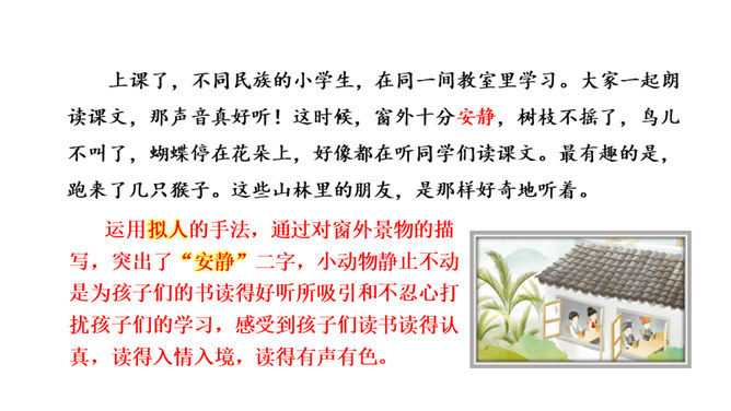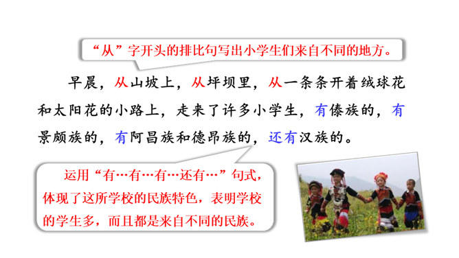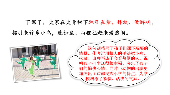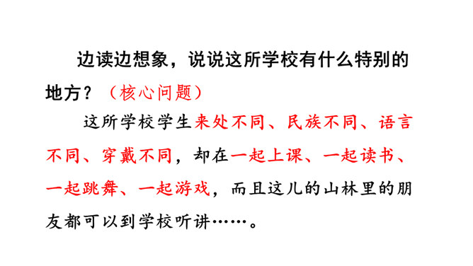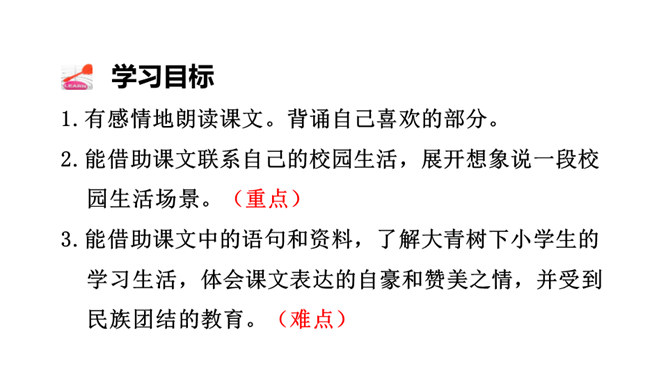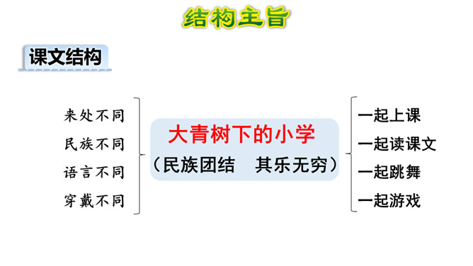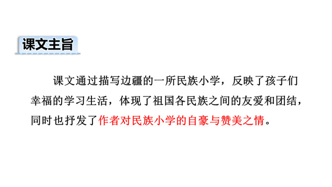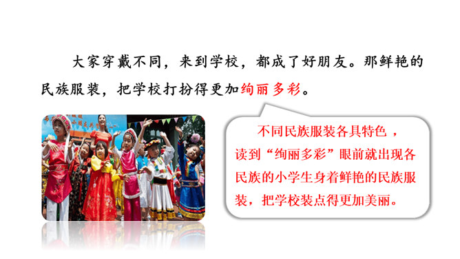 1.有感情地朗读课文。背诵自己喜欢的部分。2.能借助课文联系自己的校园生活,展开想象说一段校园生活场景。(重点)3.能借助课文中的语句和资料,了解大青树下小学生的学习生活,体会课文表达的自豪和赞美之情,并受到民族团结的教育。(难点)让我们走进课文,看看大青树下的小学及孩子们的学习生活情景是什么样的?不同民族服装各具特色 ,读到“绚丽多彩”眼前就出现各民族的小学生身着鲜艳的民族服装,把学校装点得更加美丽。所属专题:大青树下的小学ppt。