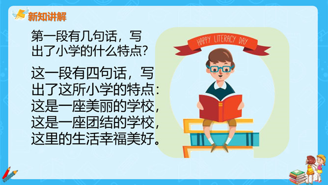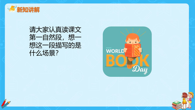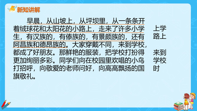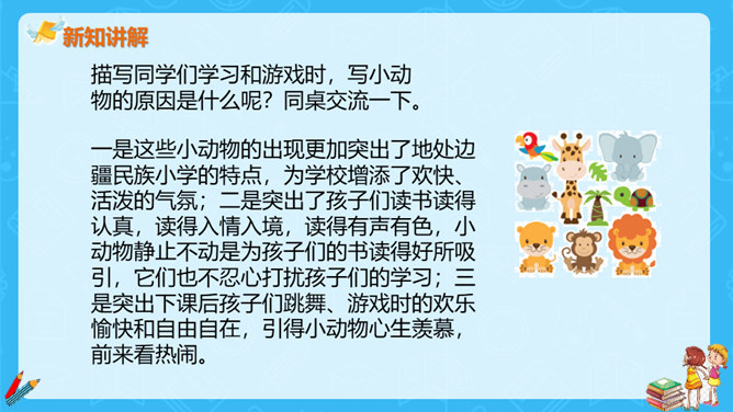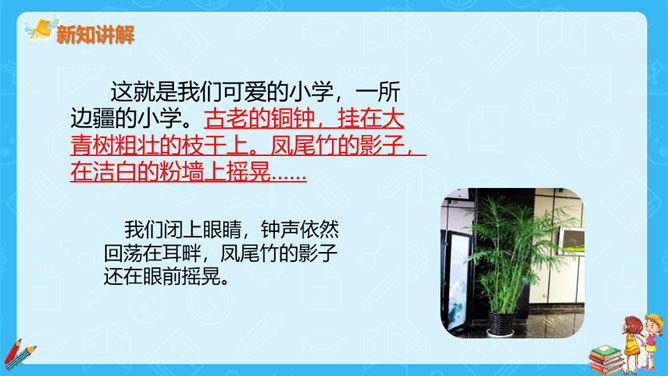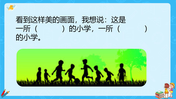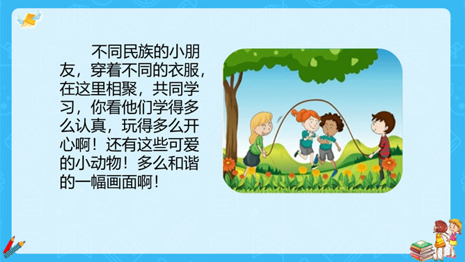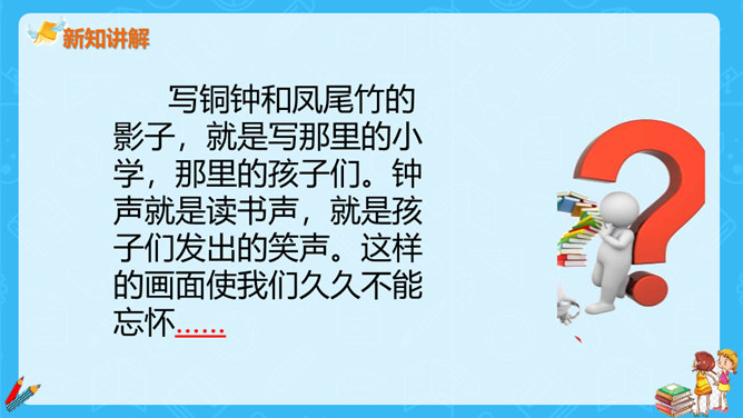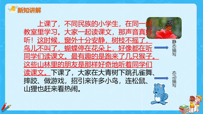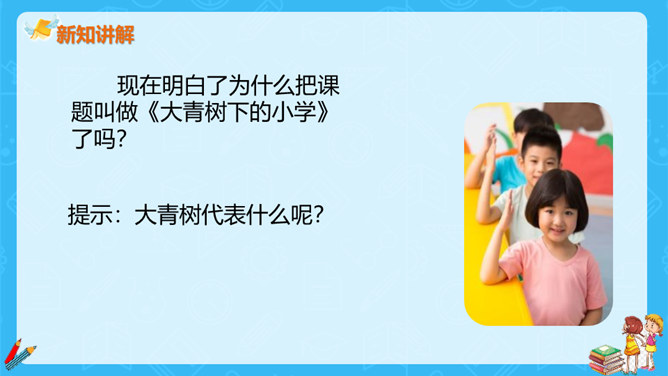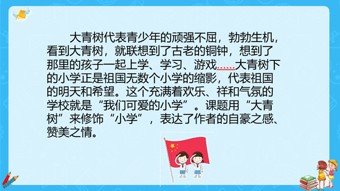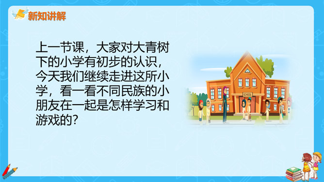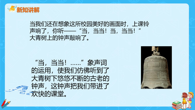 上一节课,大家对大青树下的小学有初步的认识,今天我们继续走进这所小学,看一看不同民族的小朋友在一起是怎样学习和游戏的?请大家认真读课文第一自然段,想一想这一段描写的是什么场景?第一段有几句话,写出了小学的什么特点?这一段有四句话,写出了这所小学的特点:这是一座美丽的学校,这是一座团结的学校,这里的生活幸福美好。当,当当!……”象声词的运用,使我们仿佛听到了大青树下悠悠不断的古老的钟声,这钟声把我们带进了欢快的课堂。所属专题:大青树下的小学ppt。