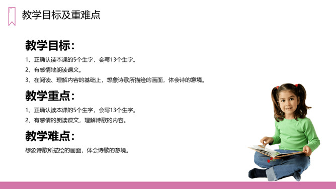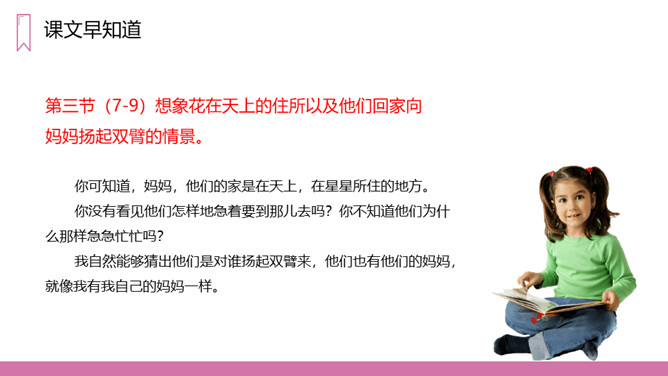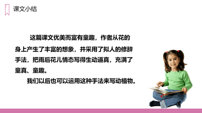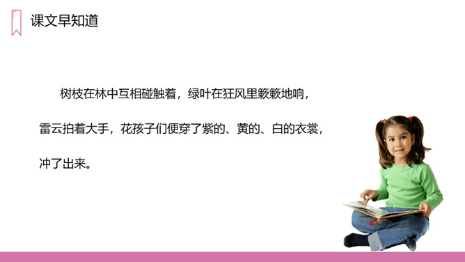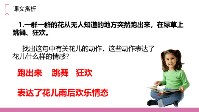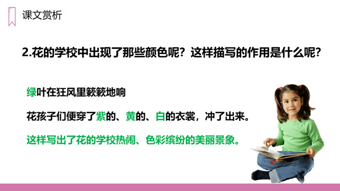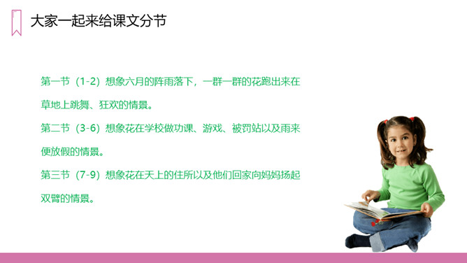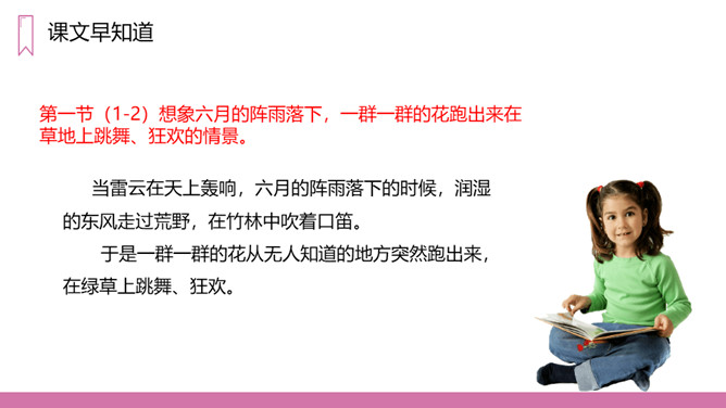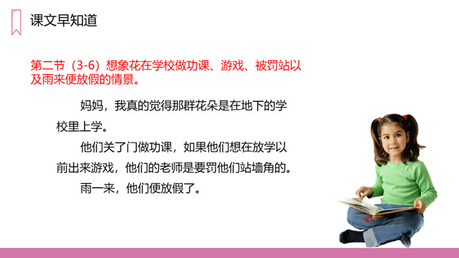 教学目标:1、正确认读本课的5个生字,会写13个生字。2、有感情地朗读课文。3、在阅读、理解内容的基础上,想象诗歌所描绘的画面,体会诗的意境。教学重点:1、正确认读本课的5个生字,会写13个生字。2、有感情的朗读课文,理解诗歌的内容。教学难点:想象诗歌所描绘的画面,体会诗歌的意境。第一节(1-2)想象六月的阵雨落下,一群一群的花跑出来在草地上跳舞、狂欢的情景。第二节(3-6)想象花在学校做功课、游戏、被罚站以及雨来便放假的情景。第三节(7-9)想象花在天上的住所以及他们回家向妈妈扬起双臂的情景。所属专题:花的学校ppt。